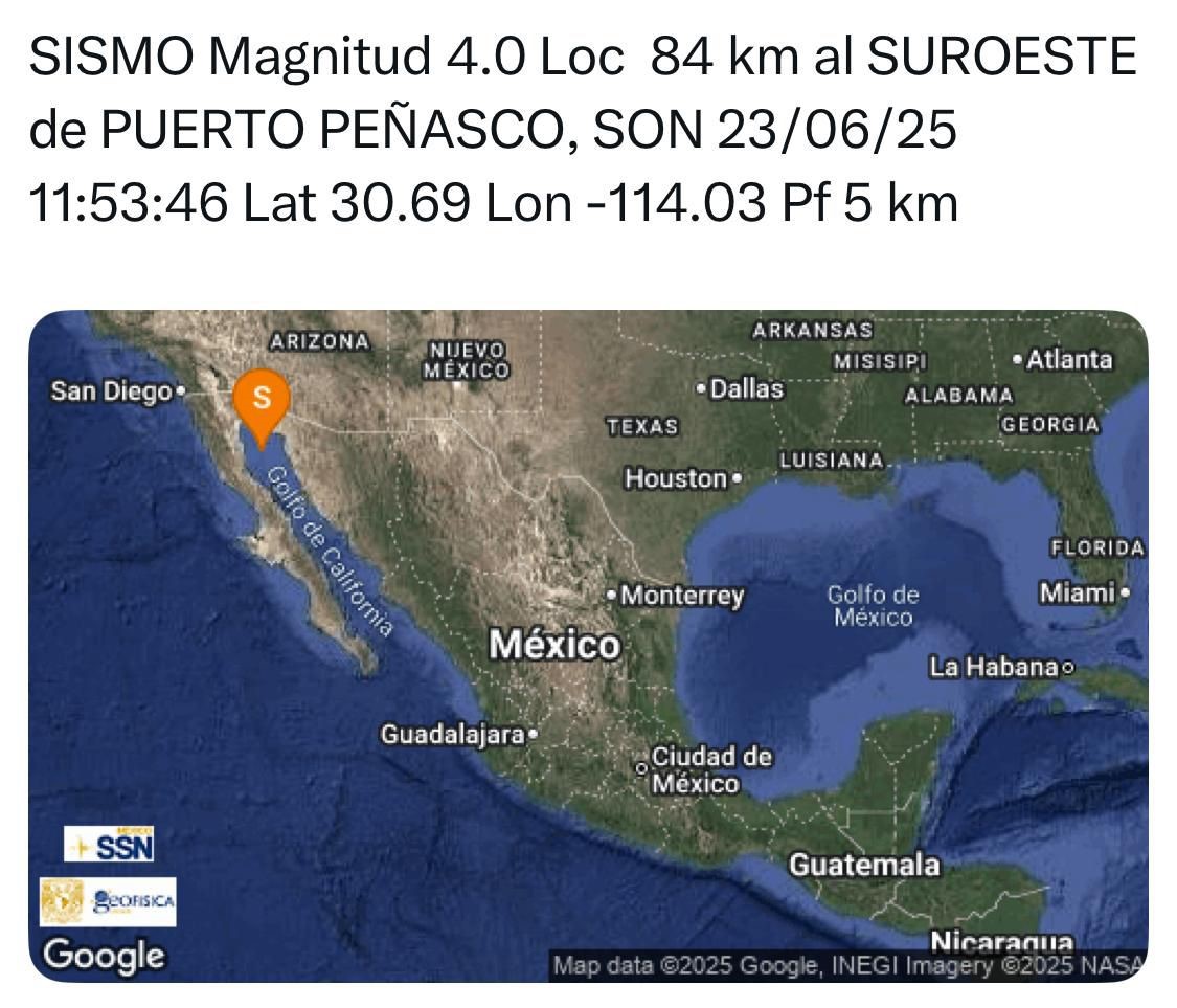 sta mañana, el Servicio Sismológico Nacional reportó un sismo de magnitud 4.0, localizado a 84 kilómetros al suroeste de Puerto Peñasco, sin que se registraran daños, víctimas ni llamadas telefónicas de la población relacionadas con el evento.