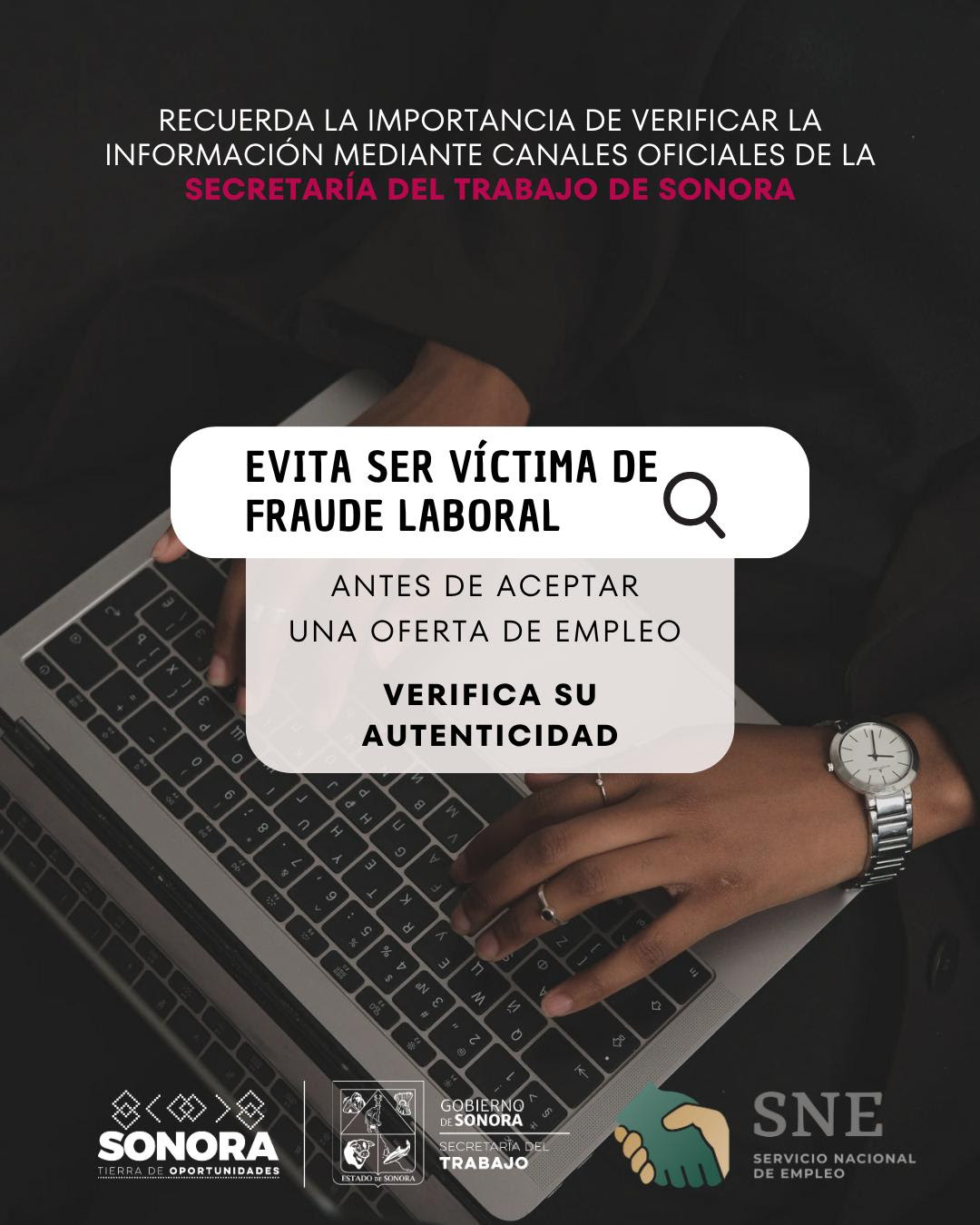 Hermosillo, Sonora; 24 de junio de 2025.- Con el objetivo de proteger a la ciudadanía, especialmente a quienes buscan empleo, el Gobierno de Sonora, a través de la Secretaría del Trabajo, advierte sobre la circulación de sitios web y anuncios falsos relacionados con ofertas laborales, principalmente en el extranjero.