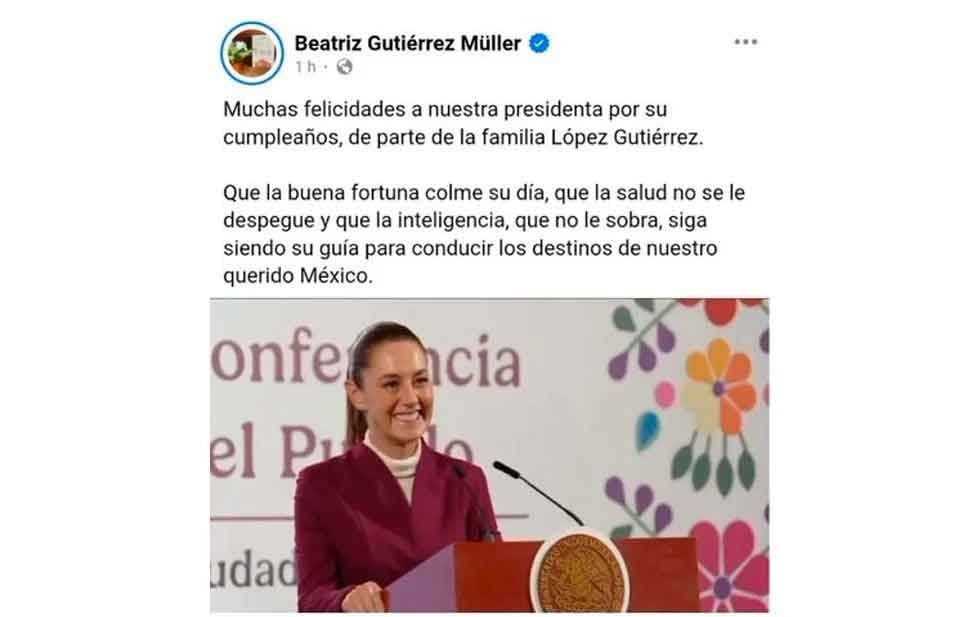 Ciudad de México.- La historiadora Beatriz Gutiérrez Müller felicitó a la Presidenta Claudia Sheinbaum por su cumpleaños 63 con un mensaje que ha causado polémica en redes sociales.
