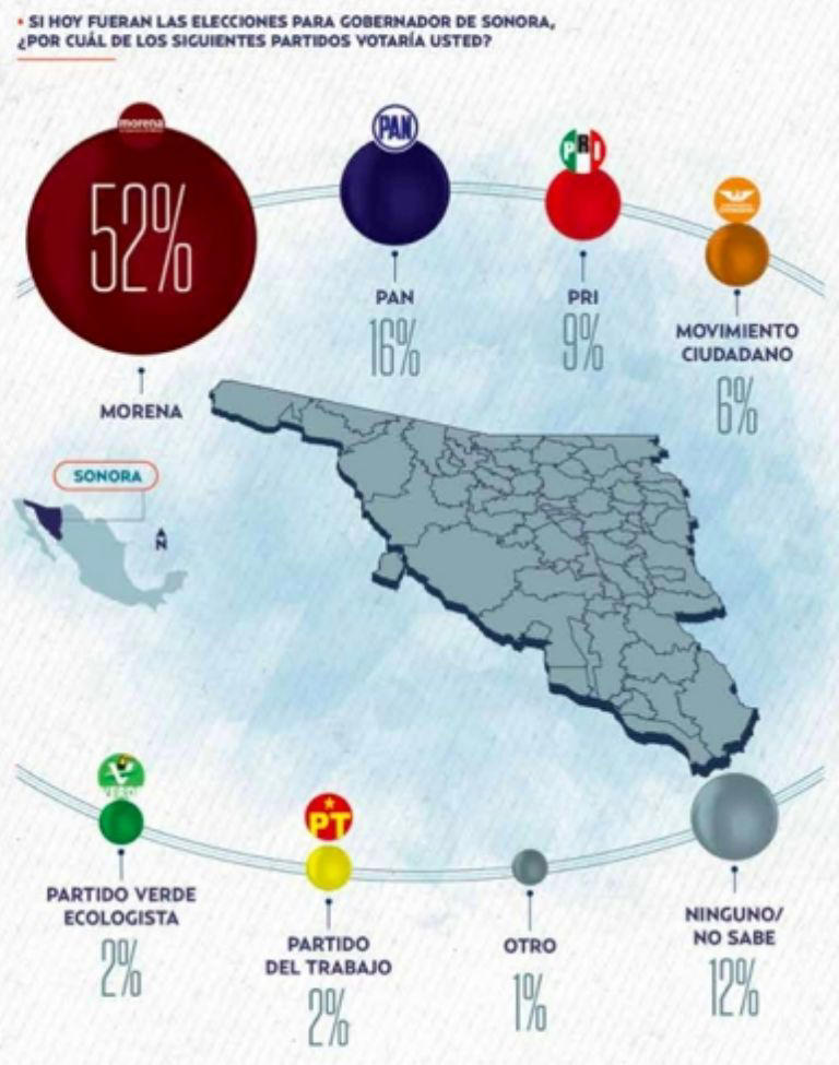 Ayer El Heraldo Media Group, que no se puede considerar un medio completamente afín a la 4T, en alianza con QM Estudios de Opinión dio a conocer el resultado de una encuesta de preferencias electorales y resultó que el 52% de los encuestados adelantó su voto por Morena. El PAN tuvo 16%, el PRI, 9% y MC el 6%, llamando la atención el PT, que se quedó muy abajo con el 2%, empatado con el Partido Verde.