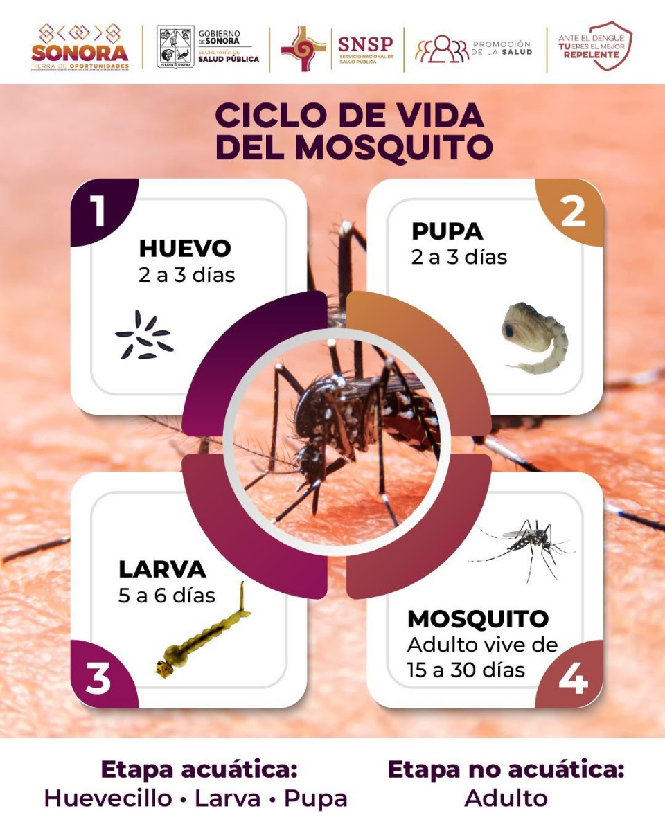 Los huevecillos del mosquito pueden desarrollarse en un periodo de dos a tres días; posteriormente, la larva vive entre cinco y seis días y, tras convertirse en pupa durante otros dos a tres días, emerge el mosquito adulto. Cabe resaltar que, debido a las condiciones ambientales de Sonora, este proceso puede ser más corto. El mosquito adulto puede vivir entre 15 y hasta 30 días, tiempo durante el cual puede poner entre 120 y 200 huevecillos por ciclo de vida, asegurando así la continuidad de su especie.