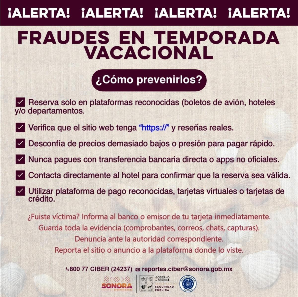 Hermosillo, Sonora; 27 de junio de 2025.- Con el objetivo de prevenir que personas interesadas en rentar departamentos, hoteles o reservar vuelos para disfrutar de sus vacaciones de verano sean víctimas de fraude, la Unidad Cibernética del Gobierno de Sonora emitió importantes recomendaciones.