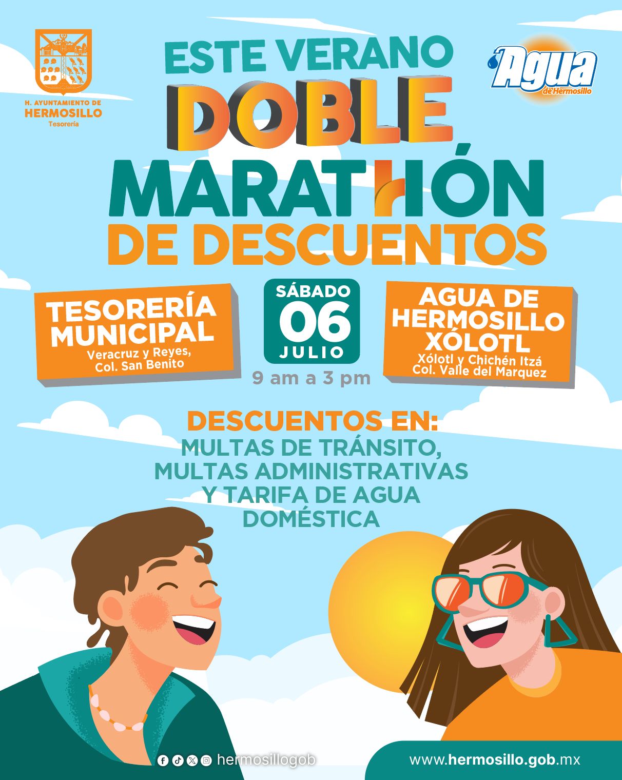 Hermosillo, Sonora; 2 de julio de 2025.- Continúan las promociones para contribuyentes de Tesorería Municipal y usuarios de Agua de Hermosillo que desean ponerse al corriente con el Doble Maratón de Descuentos, a realizarse el sábado 5 de julio en horario de 9:00 a 15:00 horas.