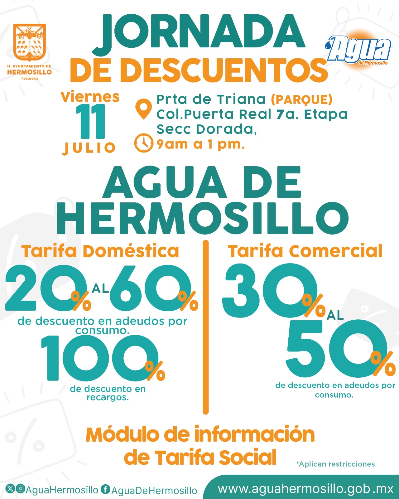 Hermosillo, Sonora; 10 de julio de 2025.– Agua de Hermosillo llevará a cabo una jornada de regularización este viernes 11 de julio en la Séptima Etapa de la colonia Puerta Real, Sección Dorada, específicamente en el parque Puerta de Triana, en un horario de 09:00 a 13:00 horas.