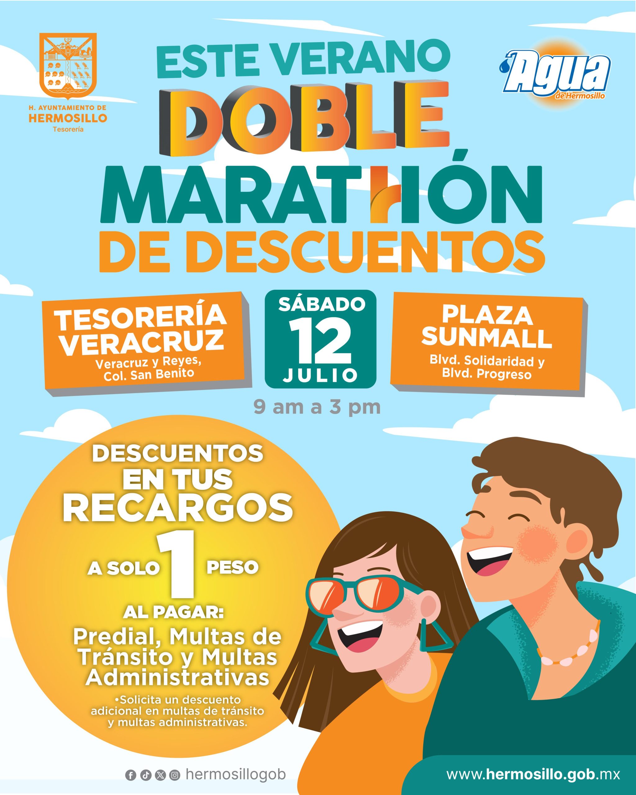 Hermosillo, Sonora, 11 de julio, 2025.- Con la promoción de julio “Tus Recargos a 1 peso” de Tesorería Municipal y descuentos en consumo doméstico y recargos de Agua de Hermosillo se realizará por decimoquinta ocasión el Doble Maratón de Descuentos este sábado 12 de julio.