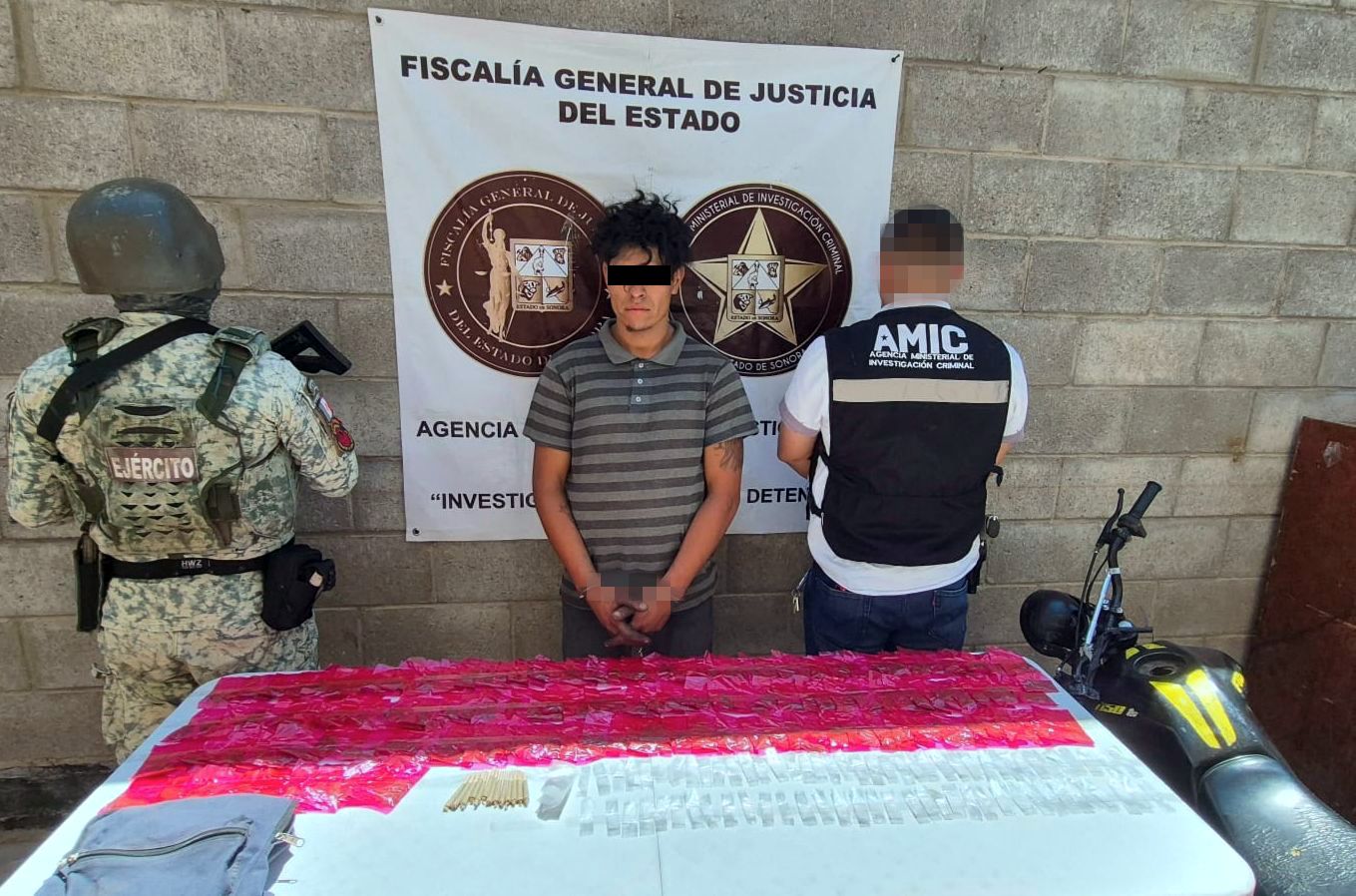 Hermosillo, Sonora, 25 de julio de 2025.- Como parte de las acciones coordinadas en combate al narcomenudeo, elementos de la Agencia Ministerial de Investigación Criminal (AMIC) y de la Secretaría de la Defensa Nacional (DEFENSA) capturaron a Isidro “N”, de 25 años, en posesión de diversas dosis de droga, durante un despliegue en la colonia Pedregal de la Villa, en Hermosillo.