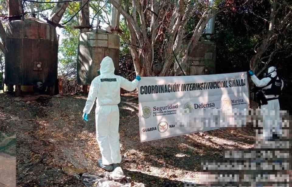 La acción fue ejecutada en el ejido de Loma y Tecomate, donde los sitios de fabricación de droga sintética fueron localizados durante recorridos terrestres de la Armada de México.