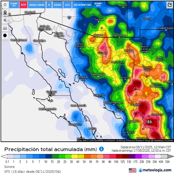 Hermosillo, Sonora; 11 de agosto de 2025.- El Gobierno de Sonora, a través de la Coordinación Estatal de Protección Civil (CEPC), informa que se espera que, a lo largo de toda esta semana, continúe la actividad de lluvias monzónicas, las cuales se caracterizan por formarse en la zona serrana del estado y extenderse por la mayor parte del territorio sonorense durante las tardes y noches.