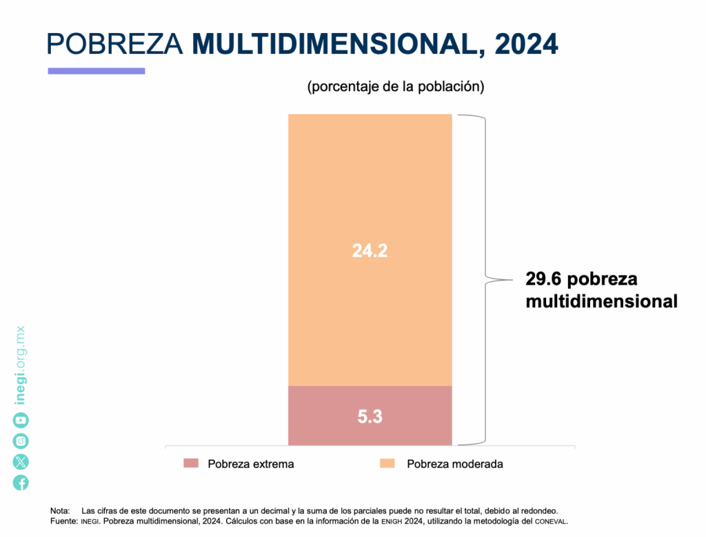 Según los datos, 29.6% de la población en México vive en pobreza; es decir, tres de cada 10 personas no tenían garantizado el ejercicio de al menos uno de sus derechos sociales, como educación, salud, seguridad social, vivienda y alimentación y su ingreso mensual por persona no fue suficiente para adquirir una canasta alimentaria, bienes ni servicios necesarios.