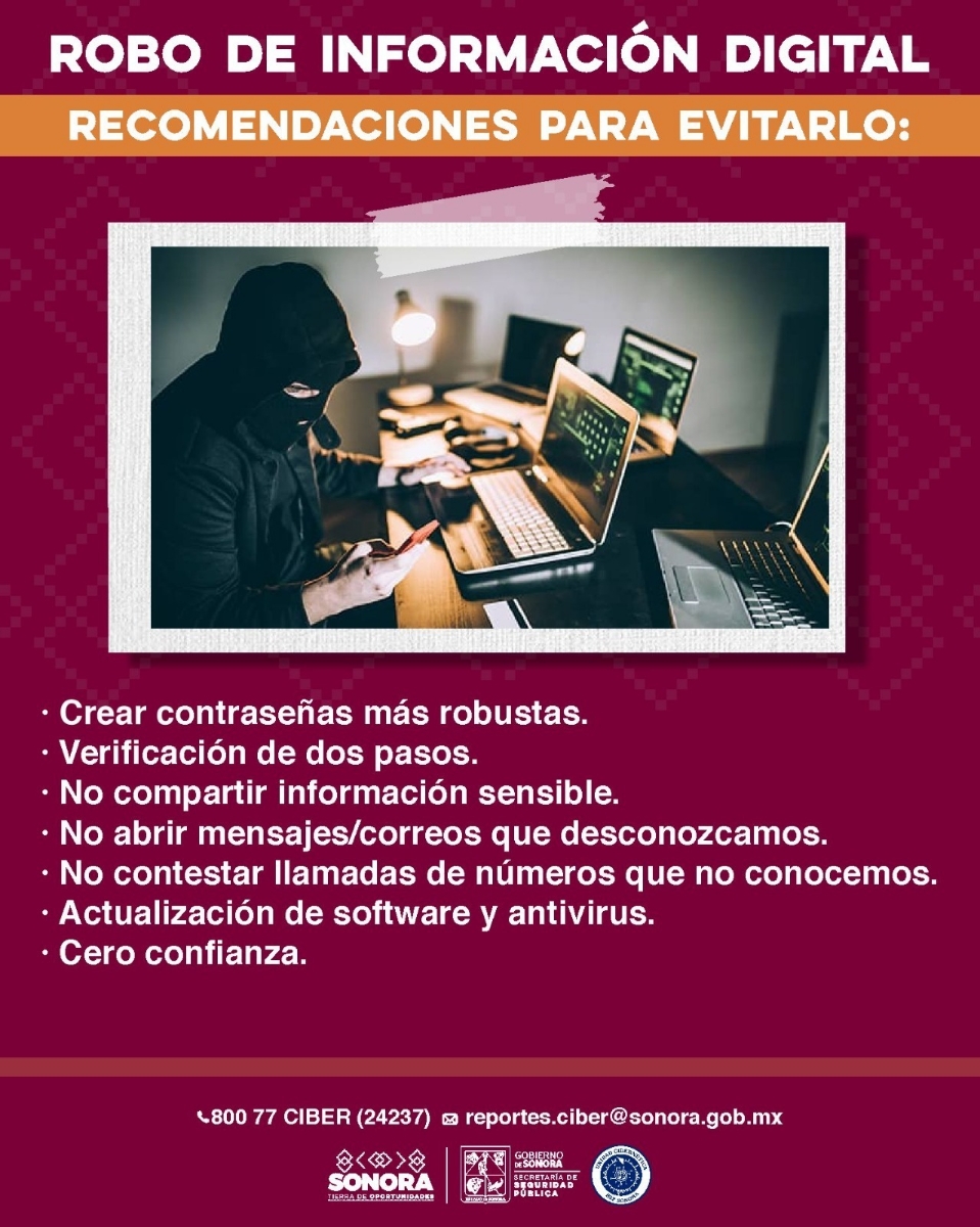 Hermosillo, Sonora; 15 de agosto de 2025.- En su carácter preventivo, la Secretaría de Seguridad Pública (SSP) del Gobierno de Sonora comparte con las y los ciudadanos información de utilidad para prevenir el robo de información digital y otros ciberdelitos.