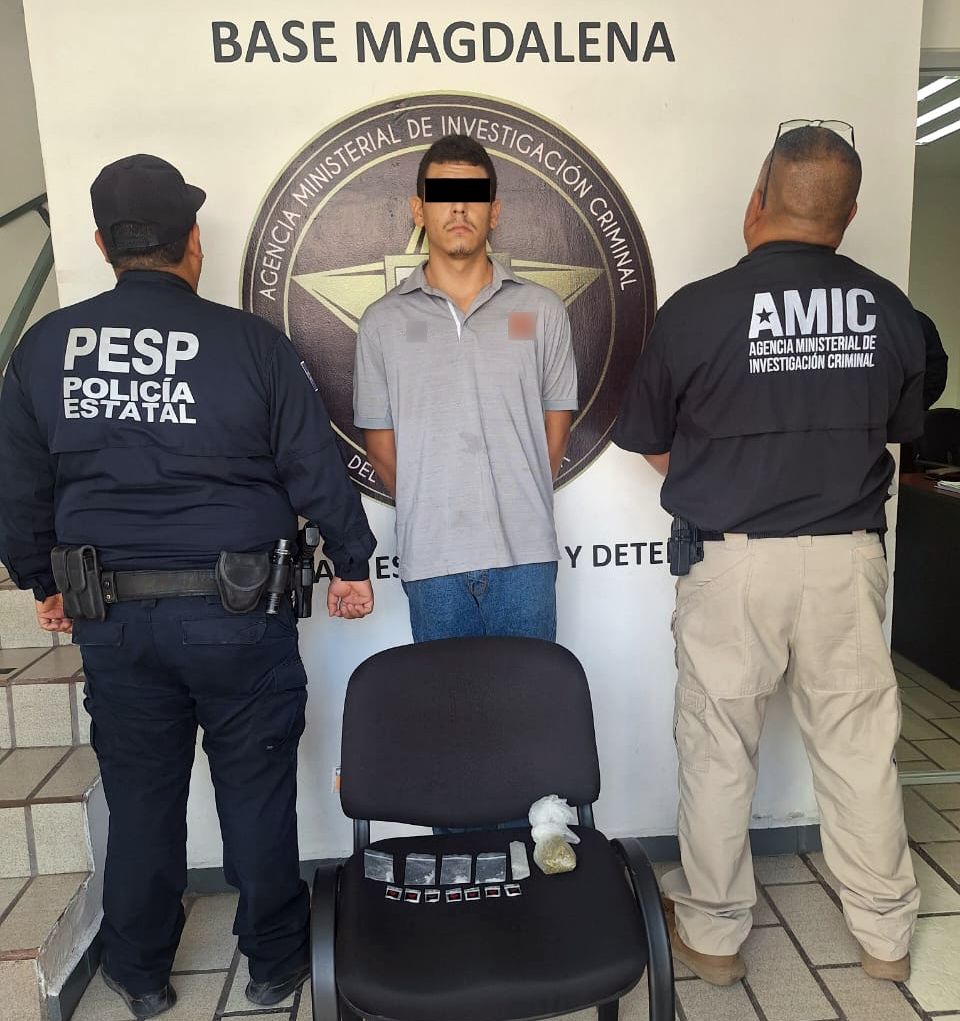 En la colonia San Martín, en Magdalena de Kino, fue asegurado Gabriel Eduardo “N”, de 25 años, quien al notar la presencia policial intentó huir, siendo alcanzado metros adelante.
