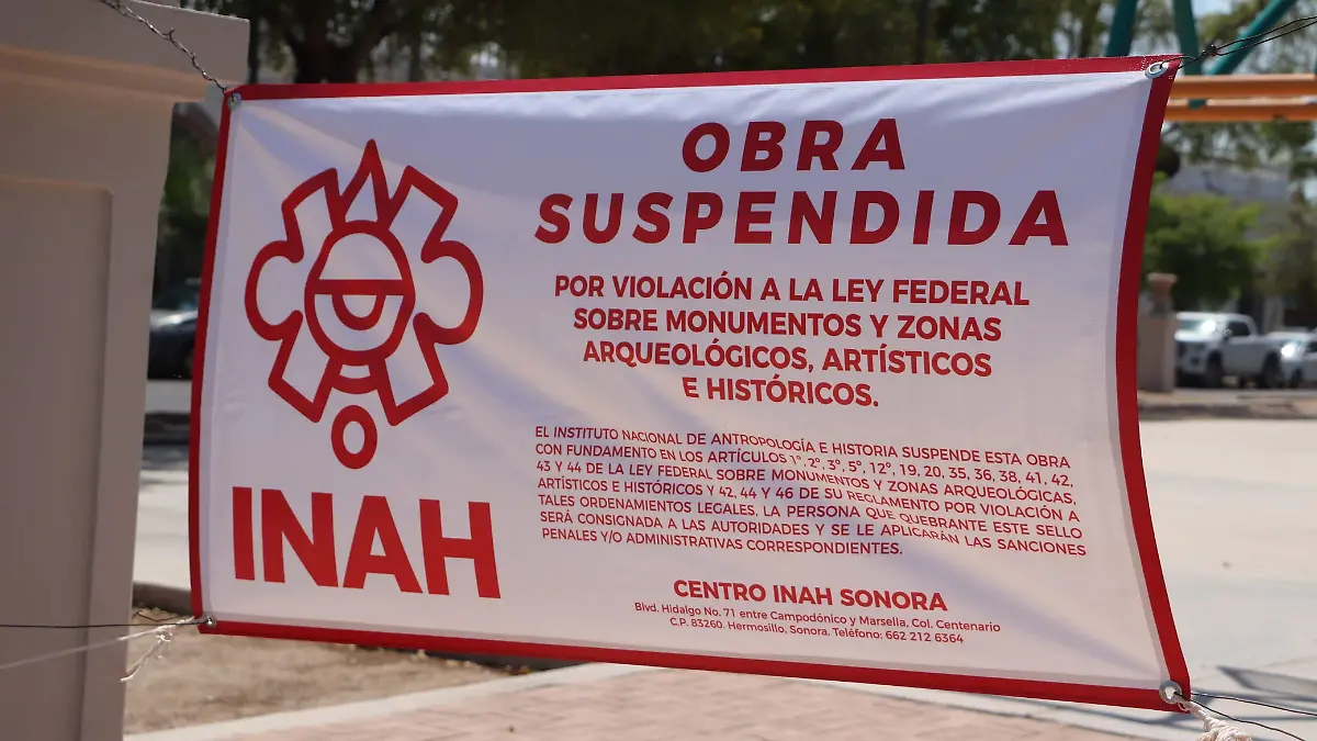 De acuerdo con información del INAH Sonora, plasmada en la lona colocada en dicho lugar este sábado por la mañana, se tiene que se ordenó la suspensión de la obra en el bulevar Hidalgo, tras detectar que se incurrió en violaciones a la Ley Federal sobre Monumentos y Zonas Arqueológicas, Artísticas e Históricas.