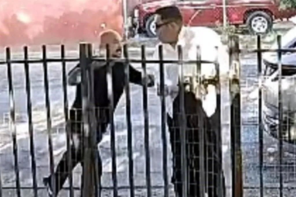 En las imágenes se observa que uno de los agresores es de apariencia robusta, vestía playera negra y pantalón de mezclilla, y el otro, aparentemente, una playera de manga larga azul, pantalón negro y una gorra en la cabeza.