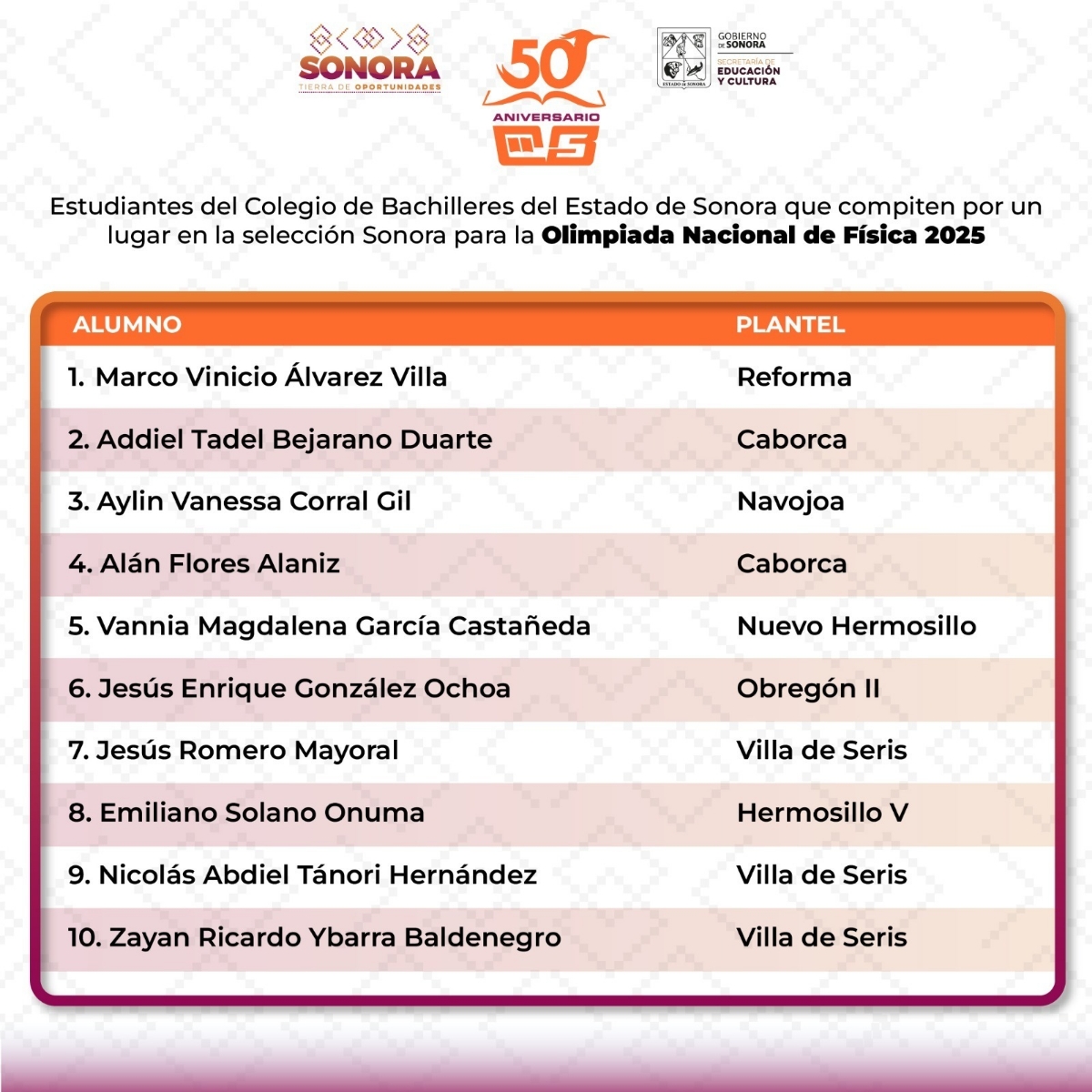 El director general de Cobach, Rodrigo Arturo Rosas Burgos, informó que los alumnos del Colegio de Bachilleres son: Jesús Romero Mayoral, Nicolás Abdiel Tánori Hernández y Zayán Ricardo Ybarra Baldenegro, del plantel Villa de Seris; Marco Vinicio Álvarez Villa, del plantel Jesús Guillermo Careaga Cruz (Reforma); y Vannia Magdalena García Castañeda, del plantel Nuevo Hermosillo.