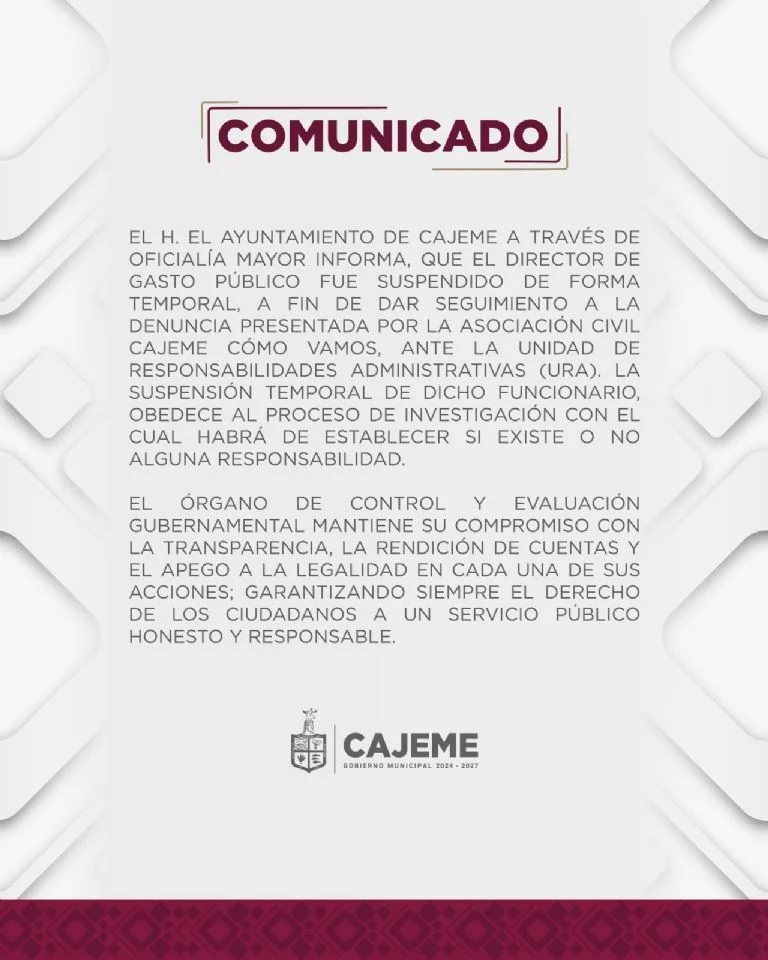 Ciudad Obregón, Sonora.- El Ayuntamiento de Cajeme confirmó la suspensión temporal del titular de la Dirección de Presupuesto y Gasto Público, quien se encuentra bajo investigación por presuntamente otorgar contratos que superan los 3.9 millones de pesos a familiares directos. La medida se tomó tras una denuncia formal presentada por la organización civil Cajeme Cómo Vamos ante instancias municipales y estatales.