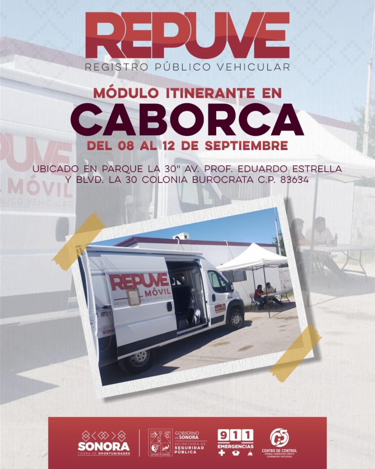 La SSP Sonora informó que, en un horario de 8:00 a 15:00 horas, personal del Repuve brindará atención en Caborca, en el Parque La 30, ubicado en Avenida Profesor Eduardo Estrella y bulevar La 30, colonia Burócrata.