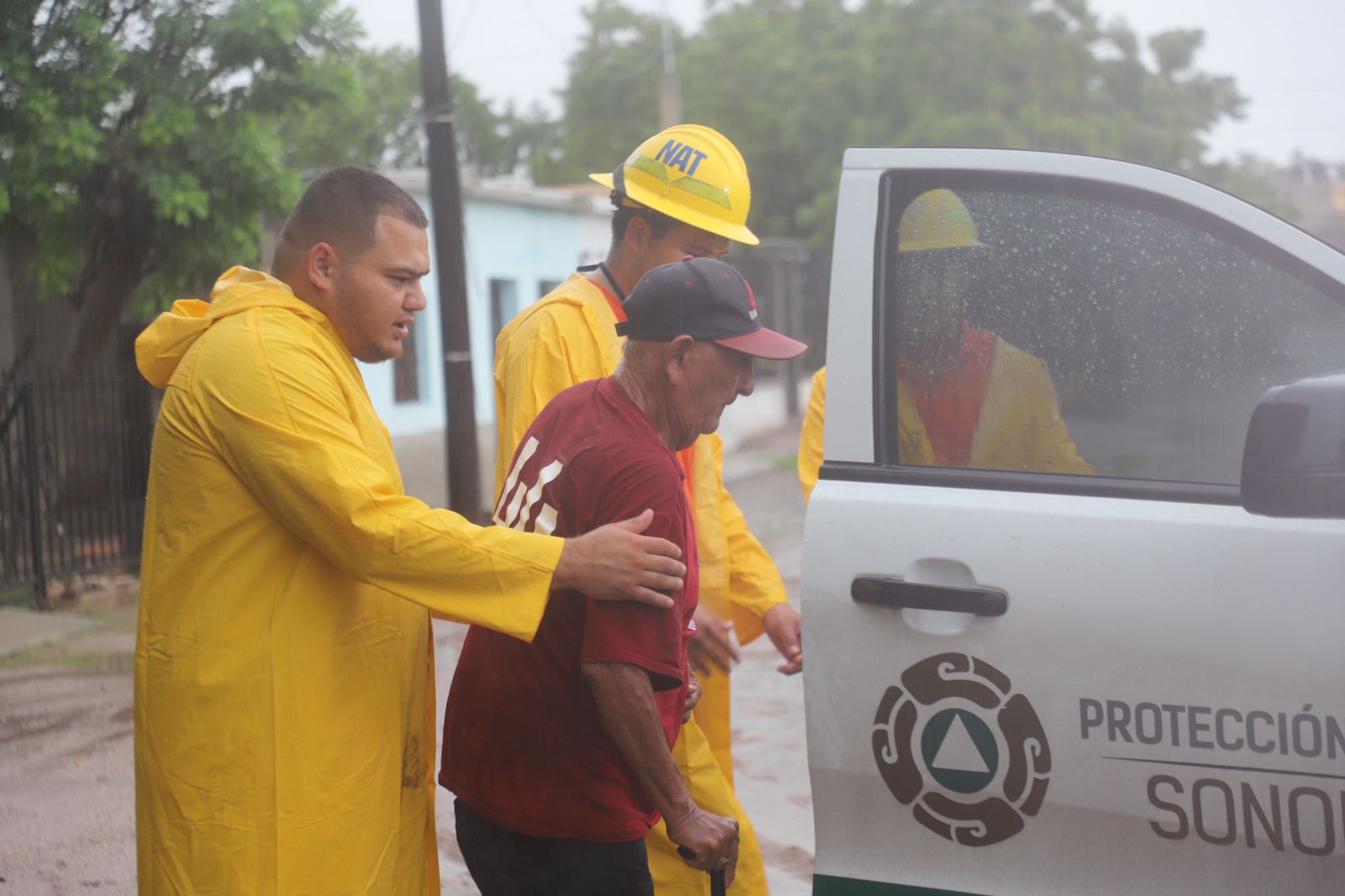 Bomberos de Navojoa y personal de la Dirección de Atención a Emergencias y Desastres de la Coordinación Estatal de Protección Civil así como de la Brigada Estatal de Manejo de Fuego de Sagarhpa y Protección Civil Sonora, realiza la evacuación preventiva de dos adultos mayores en el municipio de Navojoa, ante las intensas lluvias.