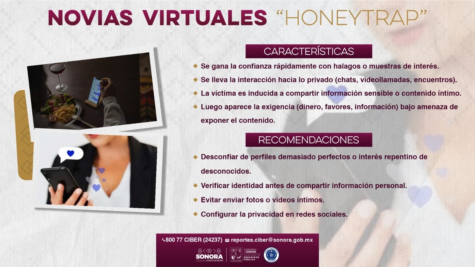 Hermosillo, Sonora; 8 de septiembre de 2025.- Con el objetivo de mantener informada a la ciudadanía y prevenir que sea víctima de delitos cibernéticos, el Gobierno de Sonora alertó sobre una nueva modalidad denominada “Novias Virtuales” o Honeytrap.