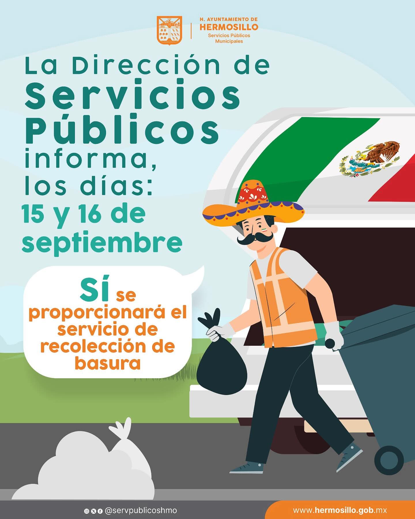 El Ayuntamiento de Hermosillo, a través de la Dirección de Servicios Públicos Municipales, informa que los días 15 y 16 de septiembre, en el marco de las celebraciones patrias, sí se llevará a cabo el servicio de recolección de basura con total normalidad en las diferentes colonias de la ciudad.