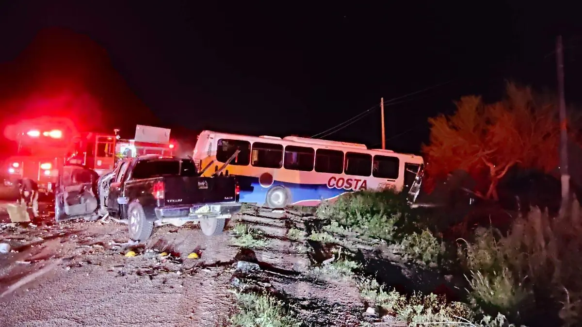 Un aparatoso accidente en la carretera a Bahía de Kino se registró este lunes a la altura del kilómetro 45, en las inmediaciones del ejido El Triunfo, cuando un camión urbano colisionó de frente contra una camioneta tipo pick up, dejando como saldo al menos 11 personas lesionadas.