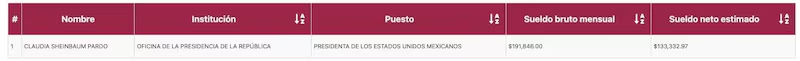 Recibe 13 mil 591 pesos con 05 centavos menos que el ingreso mensual neto estimado de la presidenta Claudia Sheinbaum que se registra en el portal de Nómina Transparente, de 133 mil 332 pesos con 97 centavos.