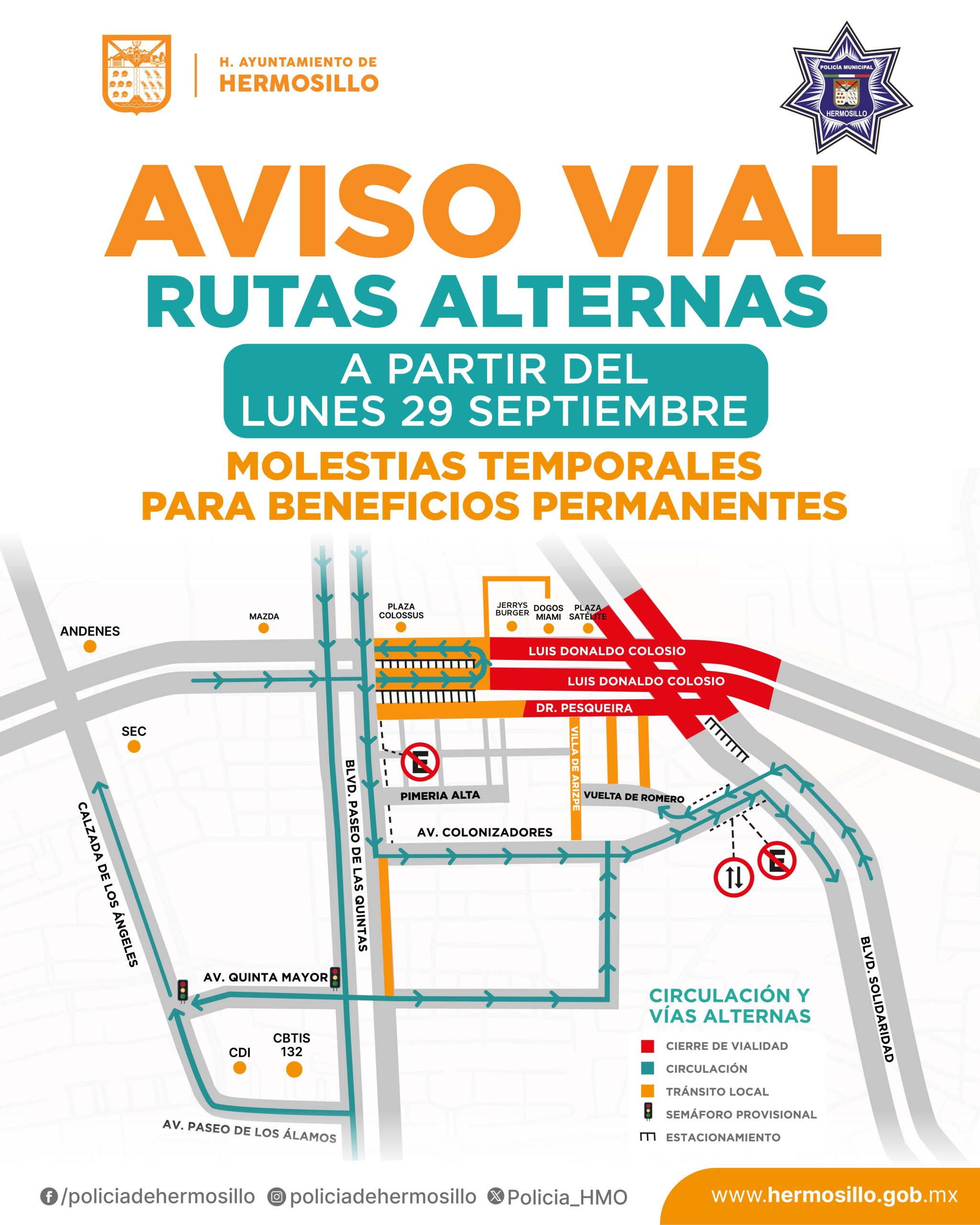 A partir del lunes los conductores que circulan desde el poniente sobre el bulevar Colosio, van a tomar el cuerpo Oriente del bulevar Las Quintas hacia el sur hasta llegar a la calle Colonizadores para salir al Solidaridad.