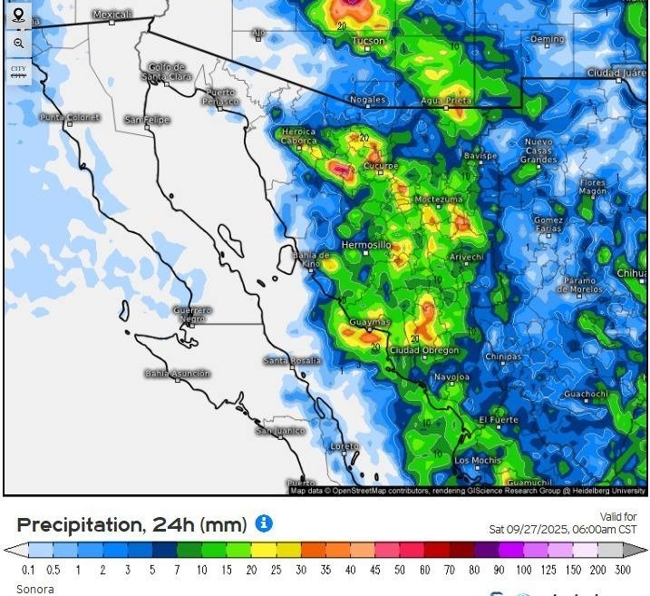 Hermosillo, Sonora; 25 de septiembre de 2025.– El Gobierno de Sonora, a través de la Coordinación Estatal de Protección Civil (CEPC), informó que a partir de hoy y durante todo el fin de semana se incrementarán las posibilidades de tormentas en el territorio estatal.