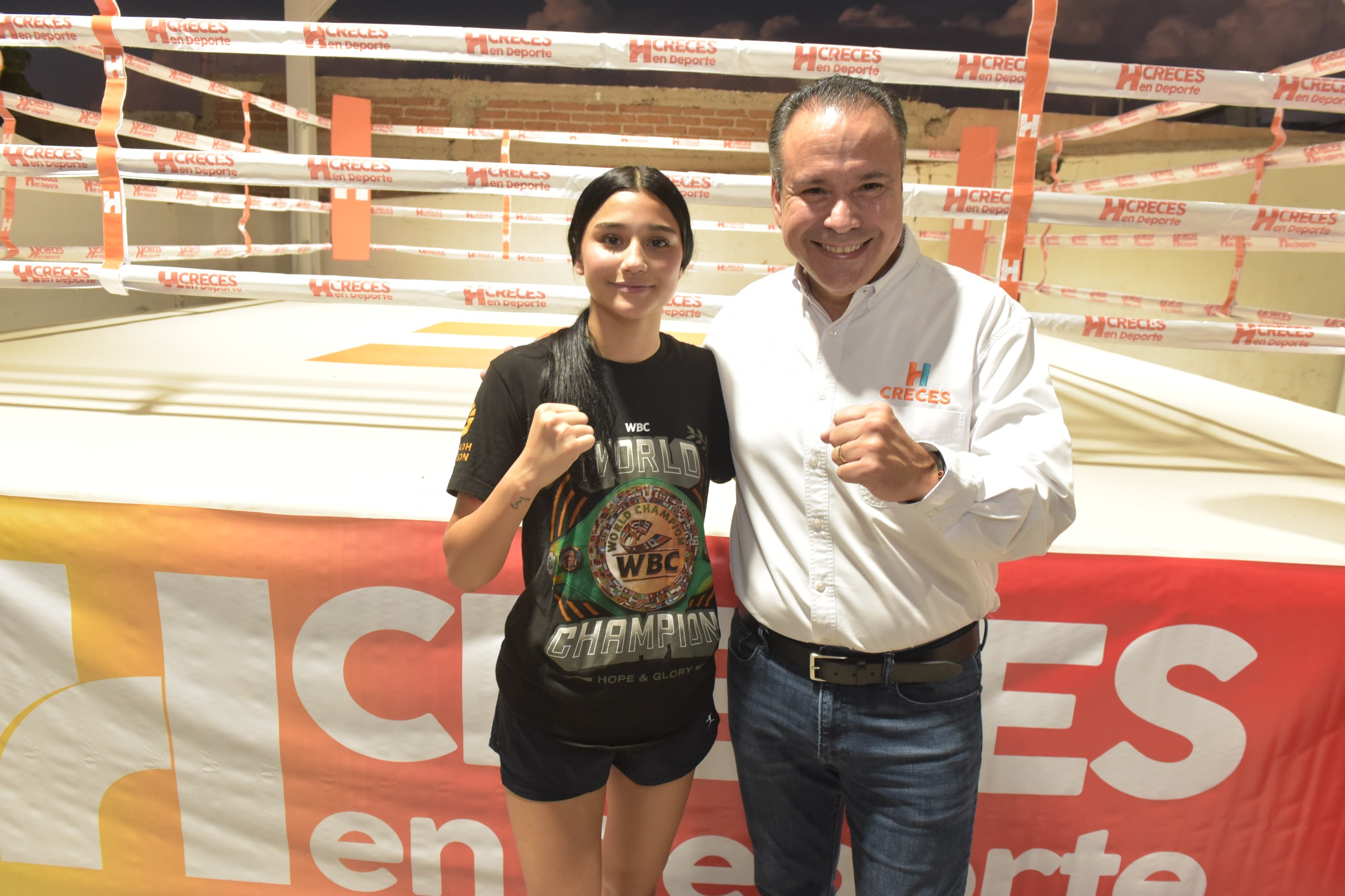 “Toño” Astiazarán acompañado por Camila “Magnifica” Zamorano, campeona mundial de peso átomo de la WBC agradeció la alianza con OXXO que materializó mejoras en cancha de basquetbol, construcción de ring de box, tejabán, e iluminación entre otras obras que suman 1.3 millones de pesos de inversión.