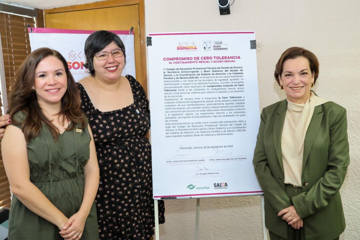 Hermosillo, Sonora; 3 de octubre de 2025.- Como parte de las acciones impulsadas por el gobernador Alfonso Durazo, orientadas a crear entornos seguros y libres de violencia, el Colegio de Educación Profesional Técnica del Estado de Sonora (Conalep) realizó la firma del Compromiso de Cero Tolerancia al Hostigamiento y Acoso Sexual.