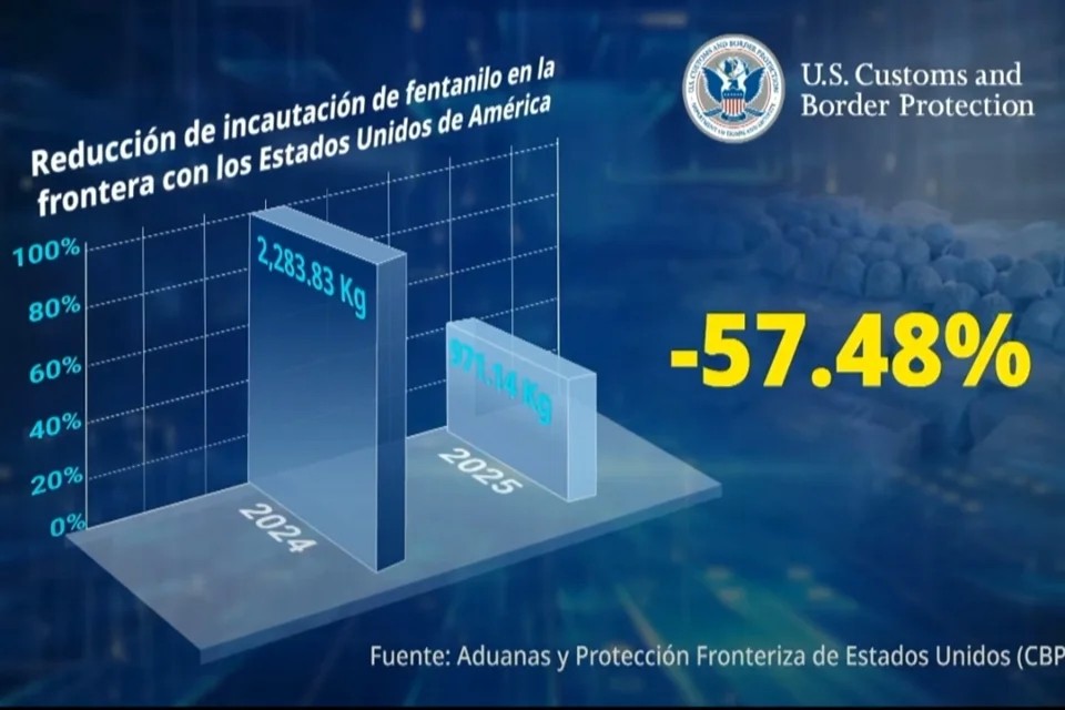 “Muestra de esto es la reducción de incautaciones de fentanilo por parte de la Oficina de Aduanas y Protección Fronteriza de ese país en un 57.48% en el segundo trimestre del 2025, en comparación con el mismo periodo de 2024”, se informó en un video presentado al final del informe que ofreció el Secretario de Seguridad, Omar García Harfuch.