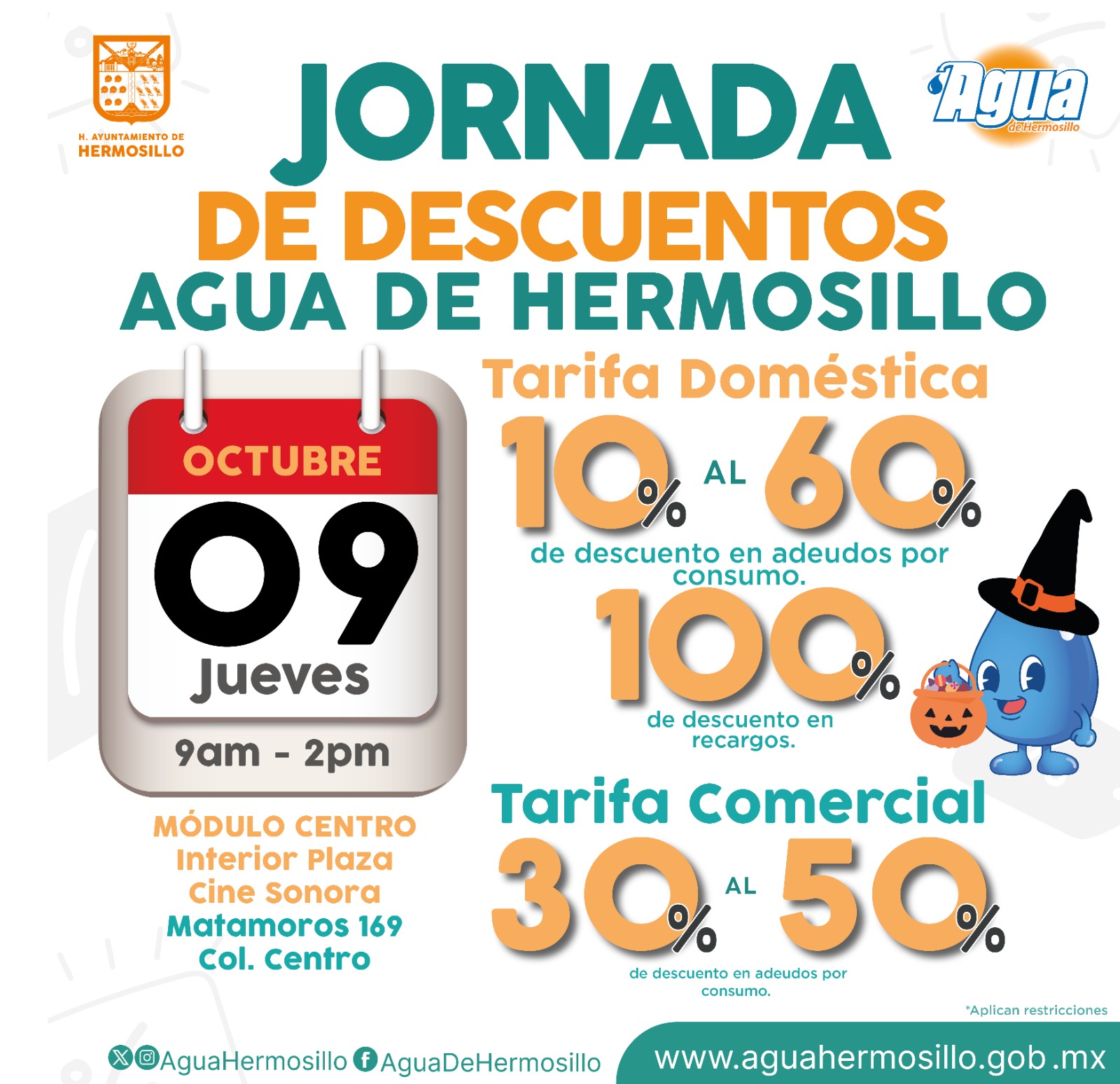 – Agua de Hermosillo convoca a sus usuarios a participar en la Jornada de Descuentos que se llevará a cabo el jueves 09 de octubre, en el Módulo Centro Interior Plaza Cine Sonora, en un horario de 9:00 a.m. a 2:00 p.m.