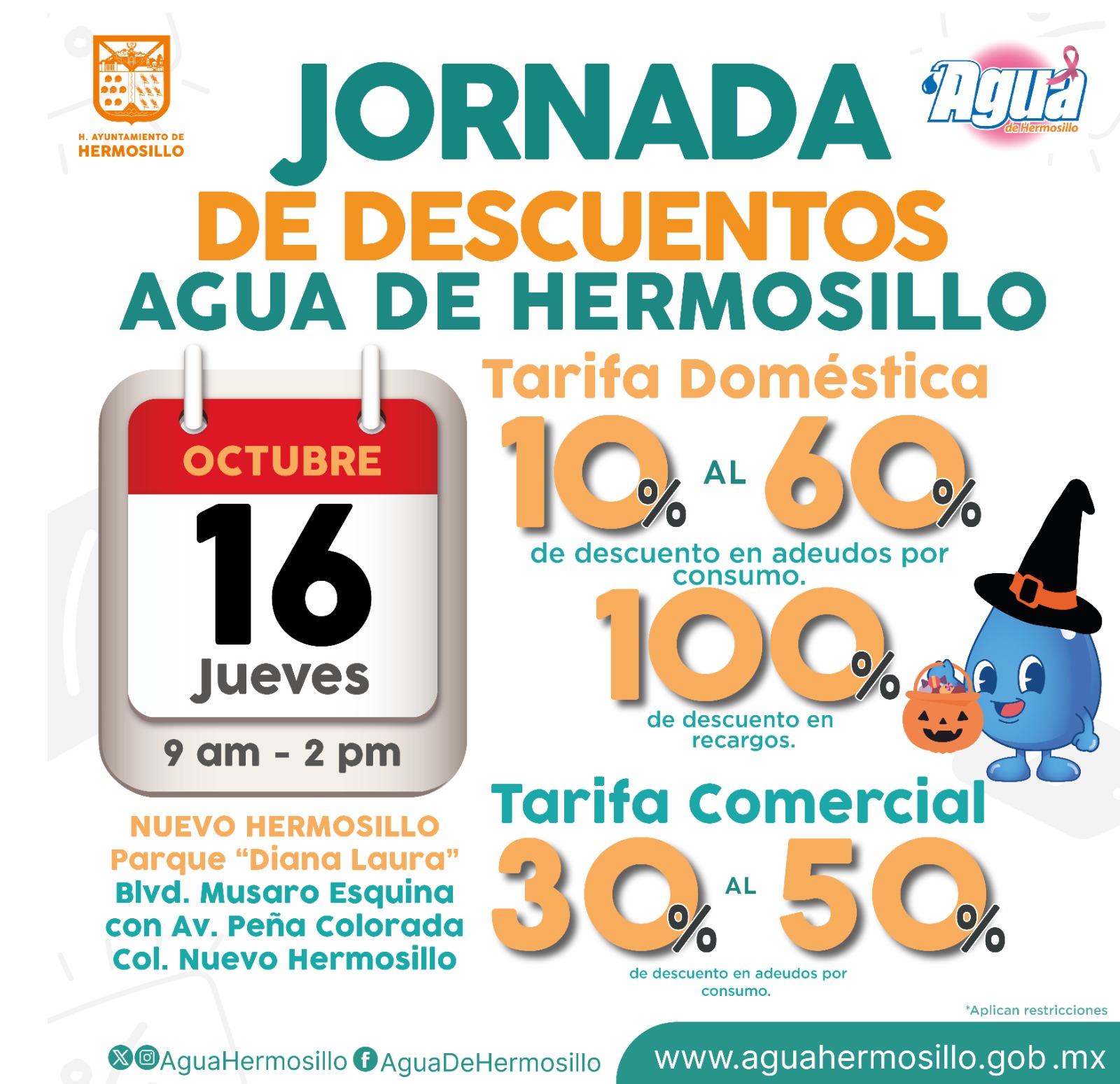 Hermosillo, Sonora, 14 de octubre de 2025.-Agua de Hermosillo invita a usuarios con tarifa doméstica y comercial a participar en su próxima Jornada de Descuentos, que se llevará a cabo el jueves 16 de octubre, en el Parque Diana Laura, ubicado en la colonia Nuevo Hermosillo, en horario de 9:00 a.m. a 2:00 p.m.
