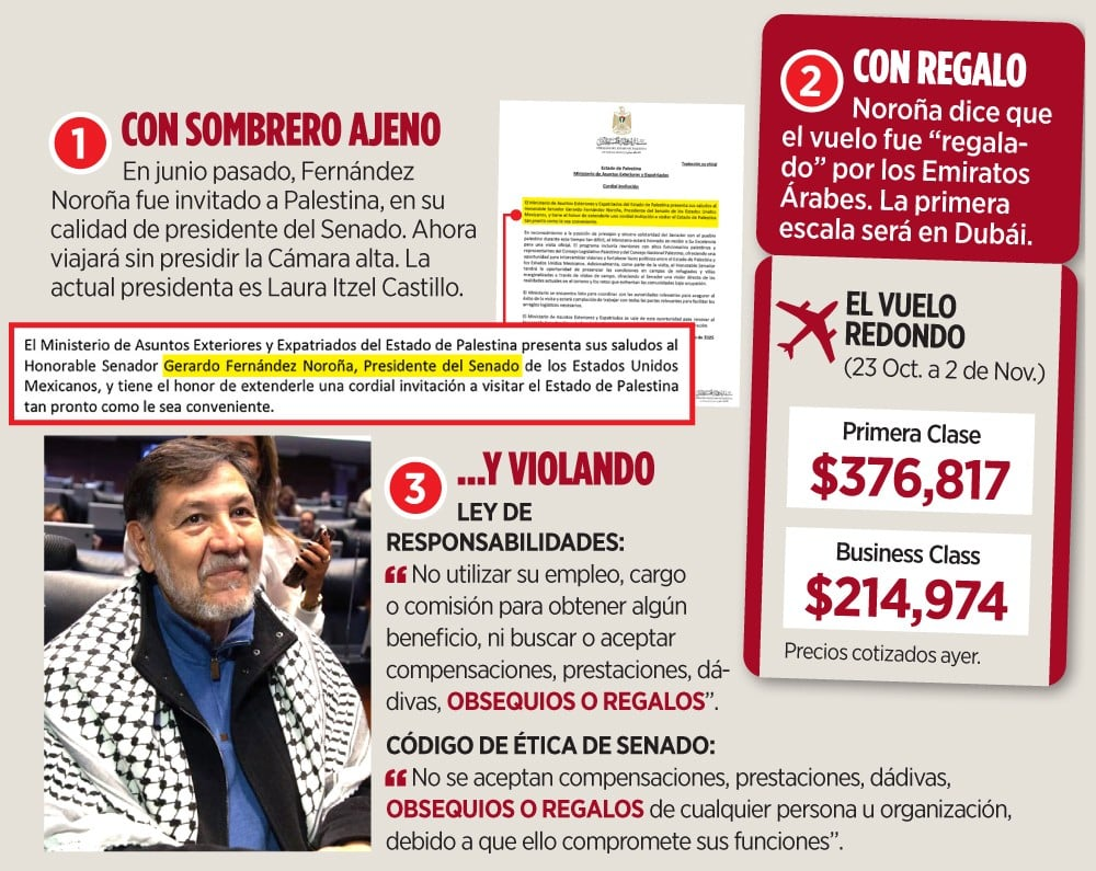 Ciudad de México.- Aunque lo tiene prohibido por la Ley de Responsabilidades, el Código de Ética del Senado y hasta por los lineamientos de Morena, el senador Gerardo Fernández Noroña viajará con gastos pagados a Medio Oriente.