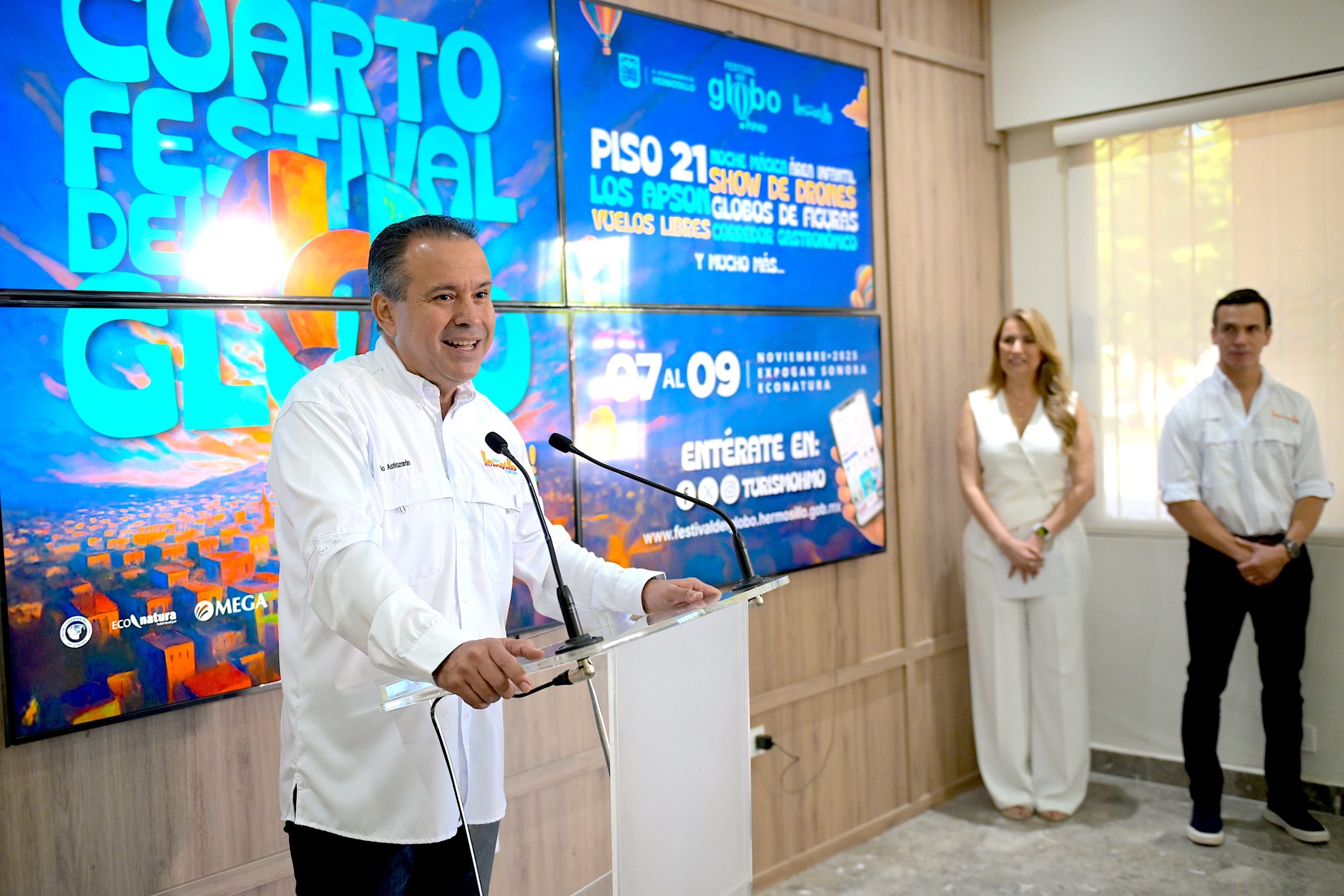Hermosillo, Sonora; 24 de octubre, 2025.-Hermosillo está listo para llenarse de color, música y diversión con la cuarta edición del Festival del Globo, anunció el presidente municipal Antonio Astiazarán, quien invitó a las familias a disfrutar de este espectáculo único que combina paisajes inolvidables con 20 globos aerostáticos, concierto gratuito de Piso 21 y muchas actividades.
