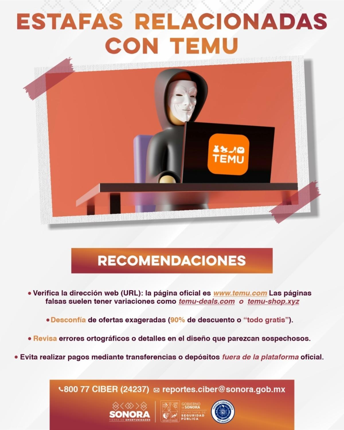 – Temu es utilizada por ciberdelincuentes para crear páginas falsas y engañar a los usuarios; no se han registrado casos en Sonora, pero se busca alertar y prevenir