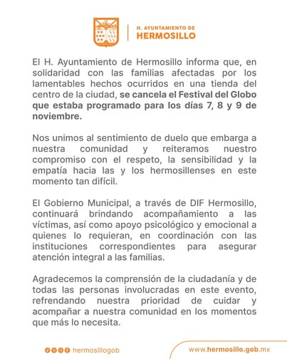 “Nos unimos al sentimiento de duelo que embarga a nuestra comunidad y reiteramos nuestro compromiso con el respeto, la sensibilidad y la empatía hacia las y los hermosillenses en este momento tan difícil”, expresó la dependencia.