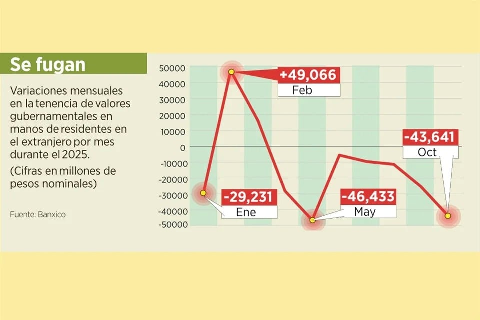 Monterrey, NL.- En octubre se registró una salida de capitales por 43 mil 641 millones de pesos, hilando siete meses consecutivos a la baja, acumulando en el año una salida por 167 mil 865 millones de pesos en valores gubernamentales, de acuerdo con cifras del Banco de México (Banxico).