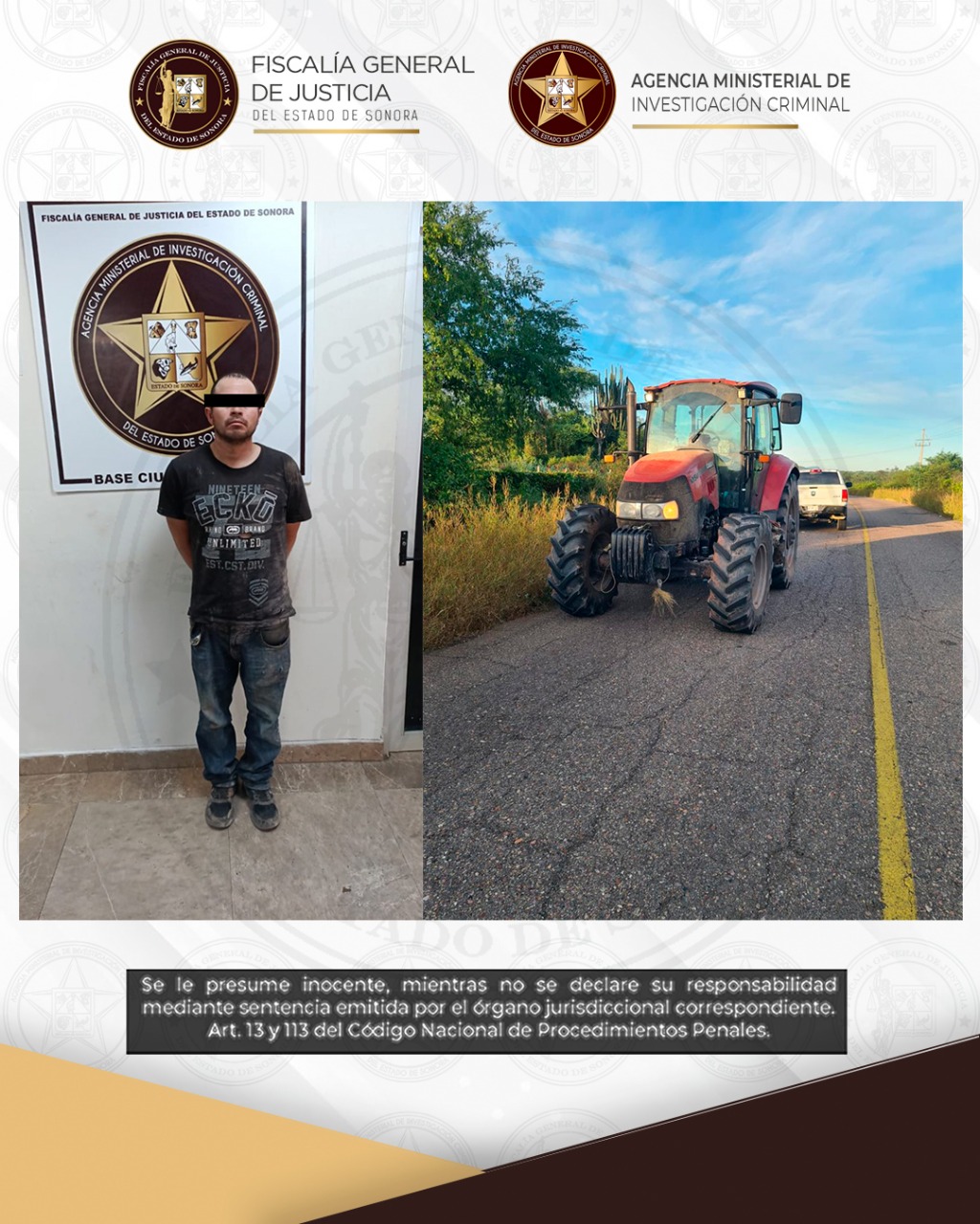 Cajeme, Sonora, 13 de noviembre de 2025.- Elementos de la Agencia Ministerial de Investigación Criminal (AMIC) ejecutaron una orden de aprehensión contra Juan Manuel “N”, de 36 años, alias “Güero” y/o “Chapo”, por su probable responsabilidad en el delito de robo de vehículo de propulsión mecánica (maquinaria agrícola) cometido con violencia en las cosas, de noche y por dos personas.