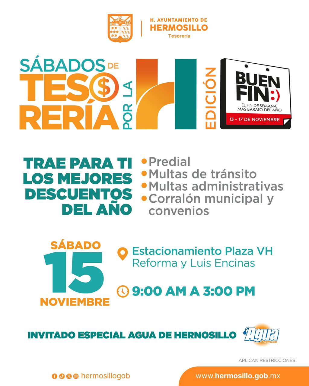 Hermosillo, Sonora; 13 de noviembre, 2025.-El Gobierno Municipal invita a aprovechar la jornada de descuentos que se realizará este sábado 15 de noviembre de 9:00 de la mañana a 3:00 de la tarde en el estacionamiento de Plaza VH ubicado en Reforma y Luis Encinas.