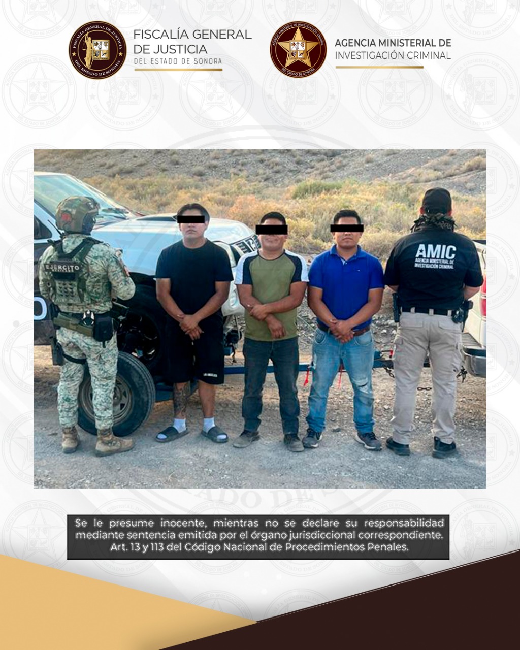 La acción se llevó a cabo a las 16:00 horas del 12 de noviembre de 2025 en las inmediaciones del Ejido Morelia, cerca de Sonoyta; los detenidos fueron identificados como Galdino Santiago “N”, de 38 años, Eric Eucario “N”, de 29 años, y César Miguel “N”, de 21 años, todos originarios de Oaxaca.