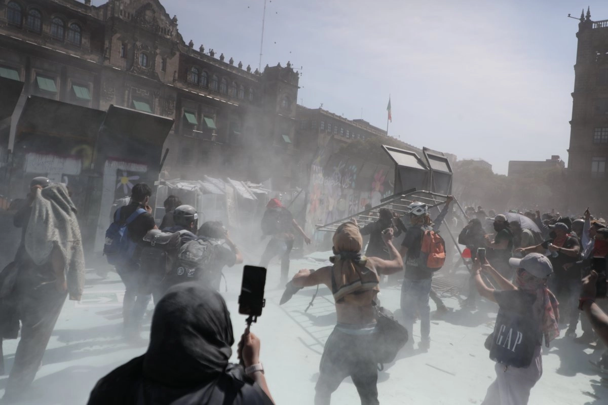 Las movilizaciones llegaron sin contratiempos al Zócalo y cuando los contingentes recién habían ingresado a la plaza, pasado el mediodía, aparecieron individuos con el rostro cubierto y llamaron a derribar las vallas metálicas que resguardaban Palacio Nacional.