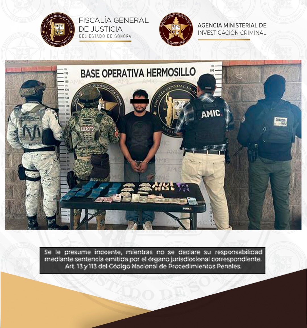 Hermosillo, Sonora, 15 de noviembre de 2025.- La Fiscalía General de Justicia del Estado de Sonora (FGJES) informa que, en un operativo conjunto entre su Agencia Ministerial de Investigación Criminal (AMIC), la Secretaría de la Defensa Nacional (DEFENSA) y la Guardia Nacional (GN), se ejecutó una orden técnica de investigación que resultó en la detención de un sujeto y el aseguramiento de narcóticos en la colonia San Bosco de la capital del estado.