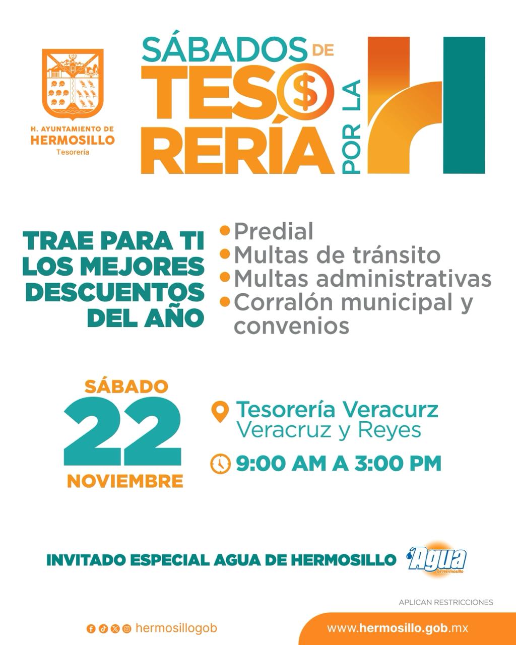 Hermosillo, Sonora; 19 de noviembre, 2025.- Las y los contribuyentes podrán aprovechar este 22 de noviembre la promoción “Sábados de Tesorería por la H”, edición Buen Fin en Tesorería Veracruz de 9:00 a 15:00 horas.