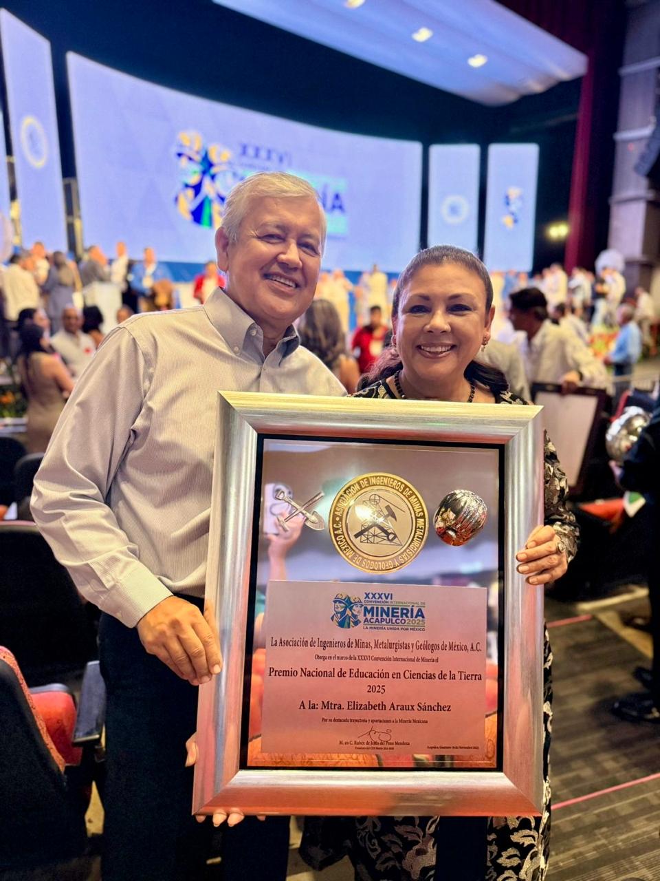 Hermosillo, Sonora, noviembre 24 de 2026.- El profesionalismo, entrega, dedicación, vocación y gran aporte en el sector académico, fueron determinantes para que Elizabeth Araux Sánchez, resultara galardonada con el Premio Nacional de Educación en Ciencias de la Tierra 2025, otorgado por la Asociación de Ingenieros de Minas, Metalurgistas y Geólogos de México (AIMMGM).