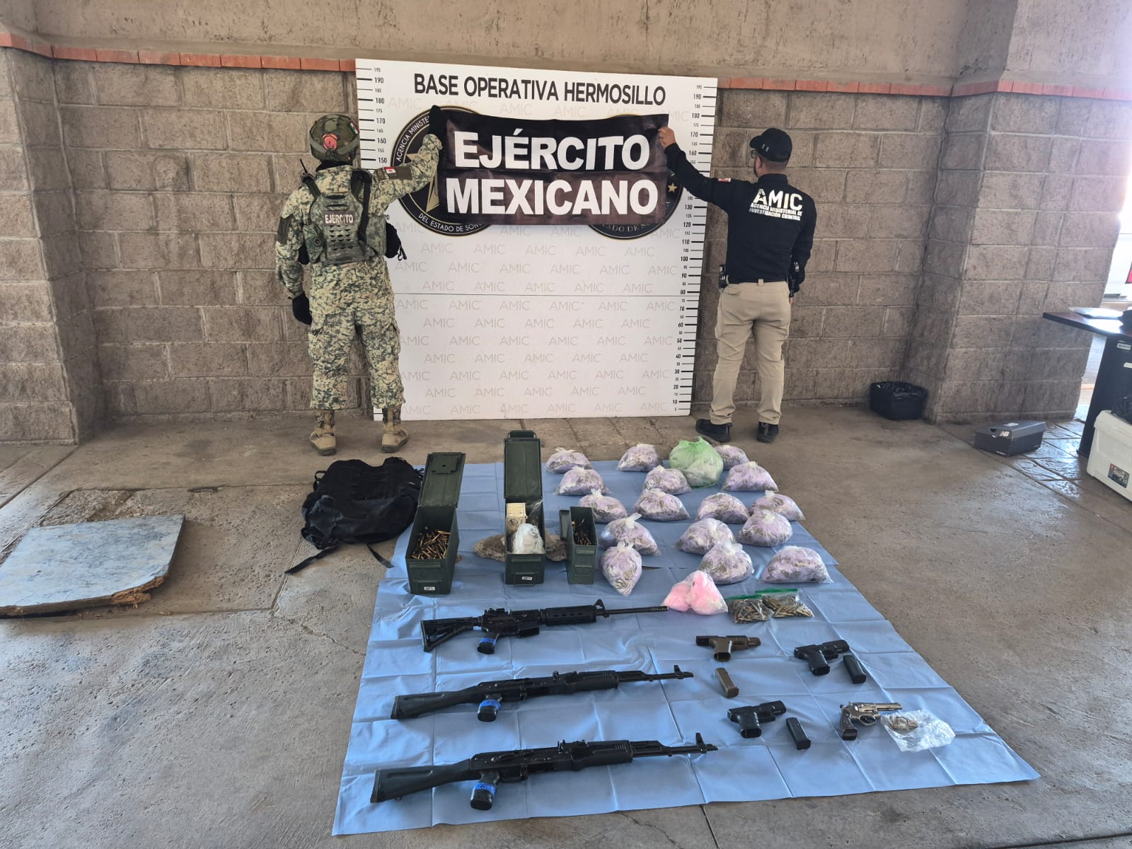 Hermosillo, Son, a 25 de noviembre de 2025.- Durante la noche del 24 y madrugada del 25 de noviembre de 2025, Elementos del Ejército Mexicano en estrecha coordinación con personal de la A.M.I.C.,llevaron a cabo un operativo en la Colonia Villas del Mediterráneo, logrando la detención de Obed N. de 24 años de edad, presunto integrante de la Delincuencia Organizada, en posesión de 100 envoltorios de plástico con una sustancia granulada con características similares a la droga conocida como cristal, un vehículo, así como $45,000 pesos en efectivo.