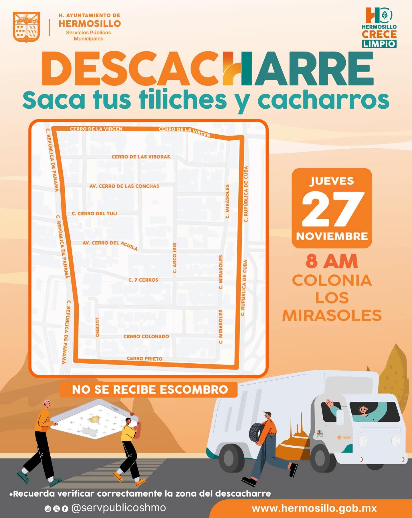 Hermosillo, Sonora; 26 de noviembre, 2025.-Como parte de las acciones que el Gobierno Municipal realiza para impedir brotes de dengue, zika y Chikunguña, así como la proliferación de fauna nociva en Hermosillo, este jueves 27 de noviembre se realizará una jornada de descacharre en la colonia Los Mirasoles.