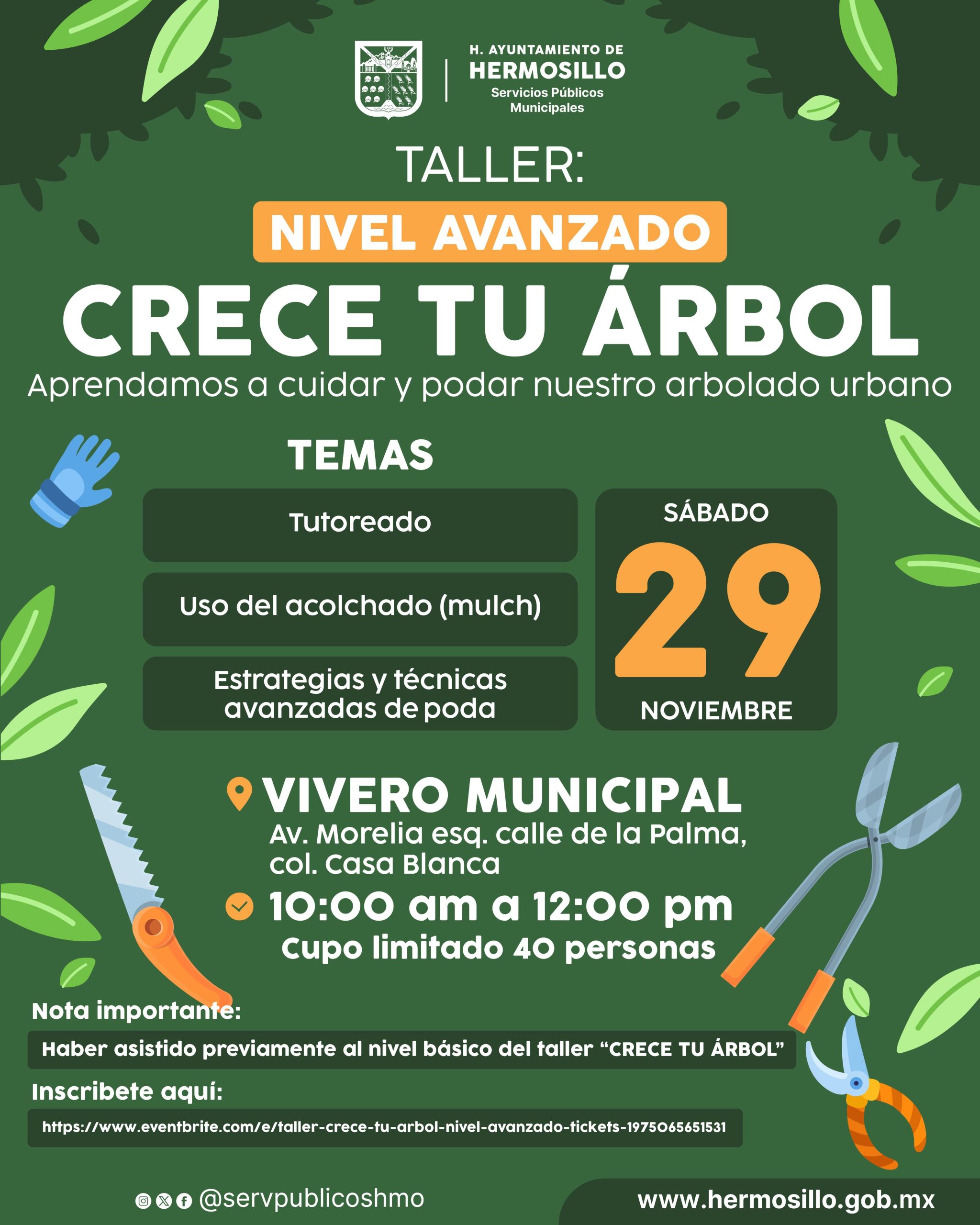La directora de Parques y Jardines de Servicios Públicos Municipales manifestó que los temas que se impartirán son: Tutoreado, Uso del acolchado (mulch) y estrategias y técnicas avanzadas de poda en horario de 10:00 a 12:00 horas con un cupo limitado a 40 personas.
