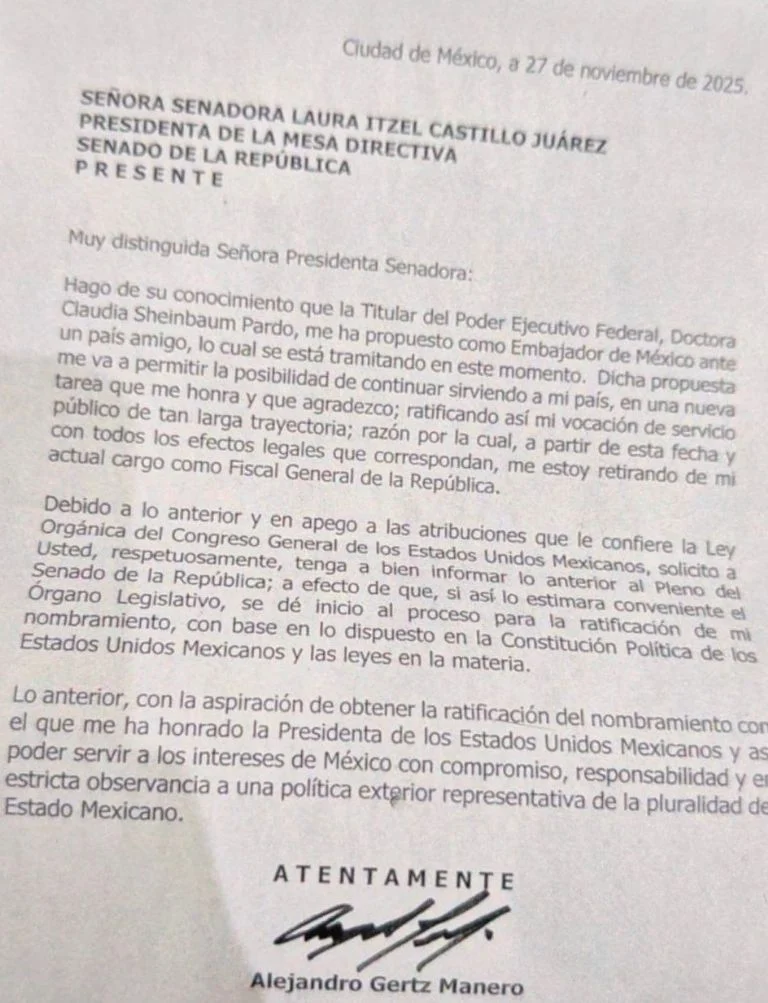 “Hago de su conocimiento que la Titular del Poder Ejecutuvo Federal, Doctora Claudia Sheinbaum Pardo, me ha propuesto como Embajador de México ante un país amigo, lo cual se está tramitando en este momento. Dicha propuesta me va a permitir la posibilidad de continuar sirviendo a mi país, en una nueva tarea que me honra y que agradezco; ratrificando así mi vocación de servicio público de tan larga trayectoria; razón por la cual, a partir de esta fecha y con todos los efectos legales que me corresponden, me estoy retirando de mi actual cargo como Fiscal General de la República”.