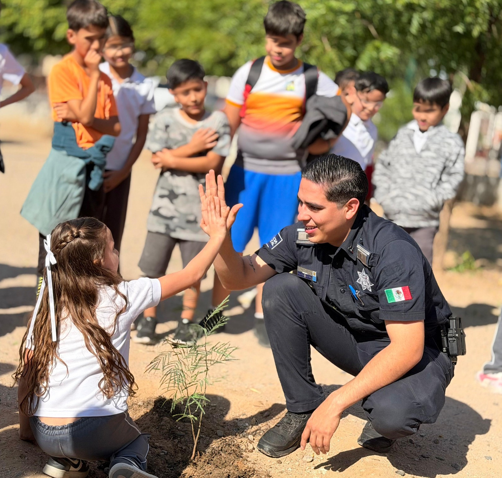 Hermosillo, Sonora; 28 de noviembre de 2025.- En un esfuerzo por fortalecer los valores comunitarios y promover el cuidado del medio ambiente, la Policía Estatal de Seguridad Pública (PESP) llevó a cabo una jornada de reforestación en la Escuela Primaria “José de Jesús Flores”, ubicada en la colonia Casa Linda.