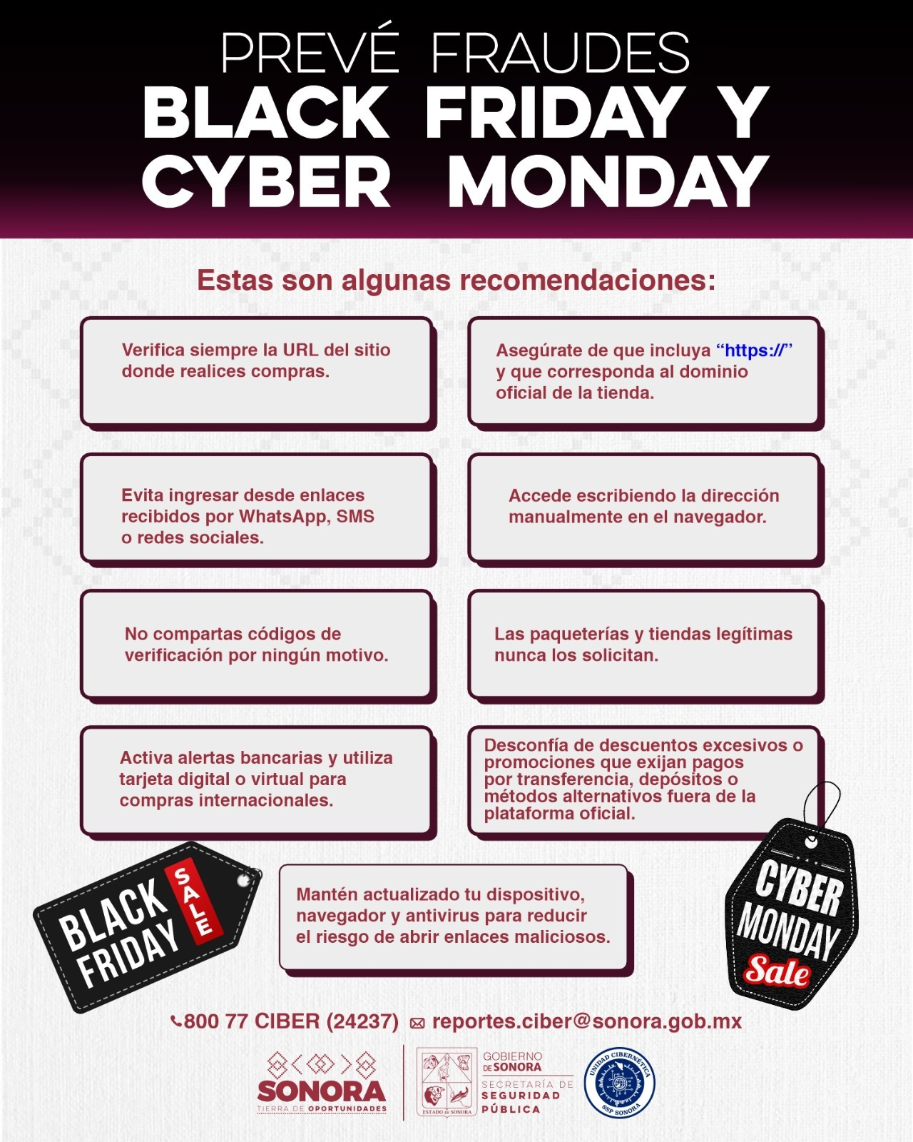 Hermosillo, Sonora; 28 de noviembre de 2025.- Con motivo del “Black Friday” y “Cyber Monday” 2025, que se llevarán a cabo durante este fin de semana, la Secretaría de Seguridad Pública, a través de la Unidad Cibernética, exhorta a la ciudadanía a extremar precauciones ante las distintas modalidades de fraude digital que suelen incrementarse durante estas jornadas de compras internacionales.
